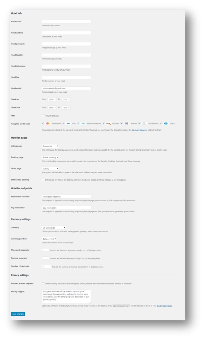 Hotelier is an easy way to control your Hotel business. There are a lot of Extensions and services for the Hotelier. You can see its settings under Dashboard > Hotelier menu: