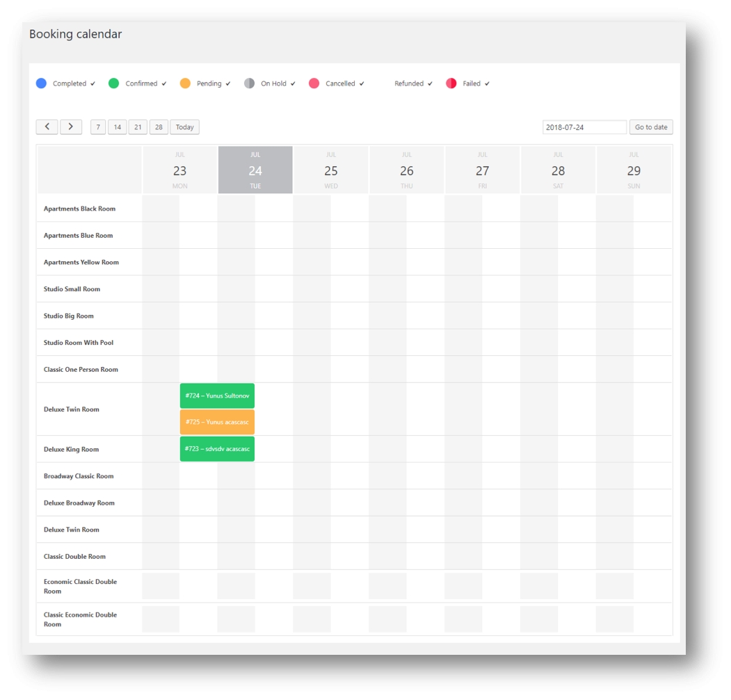 Hotelier provides easy to see Calendar section on Dashboard in order to control all reservations. You can see this under Hotelier > Calendar: