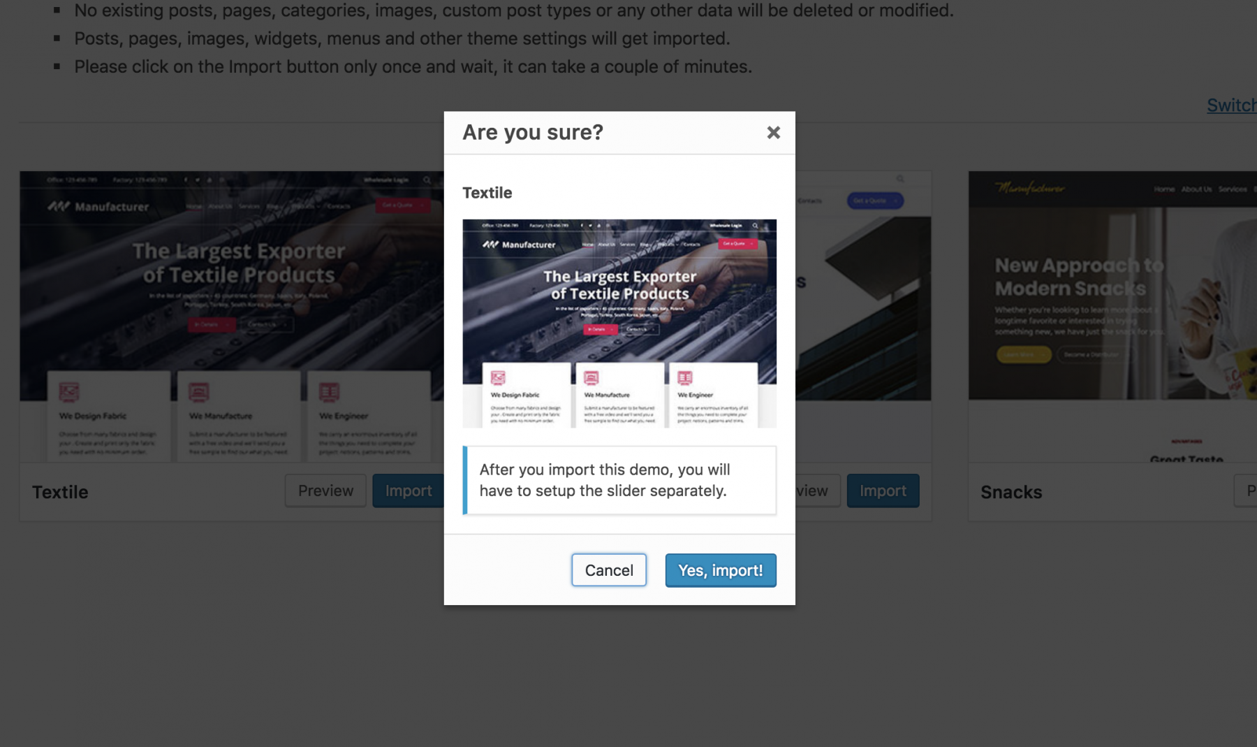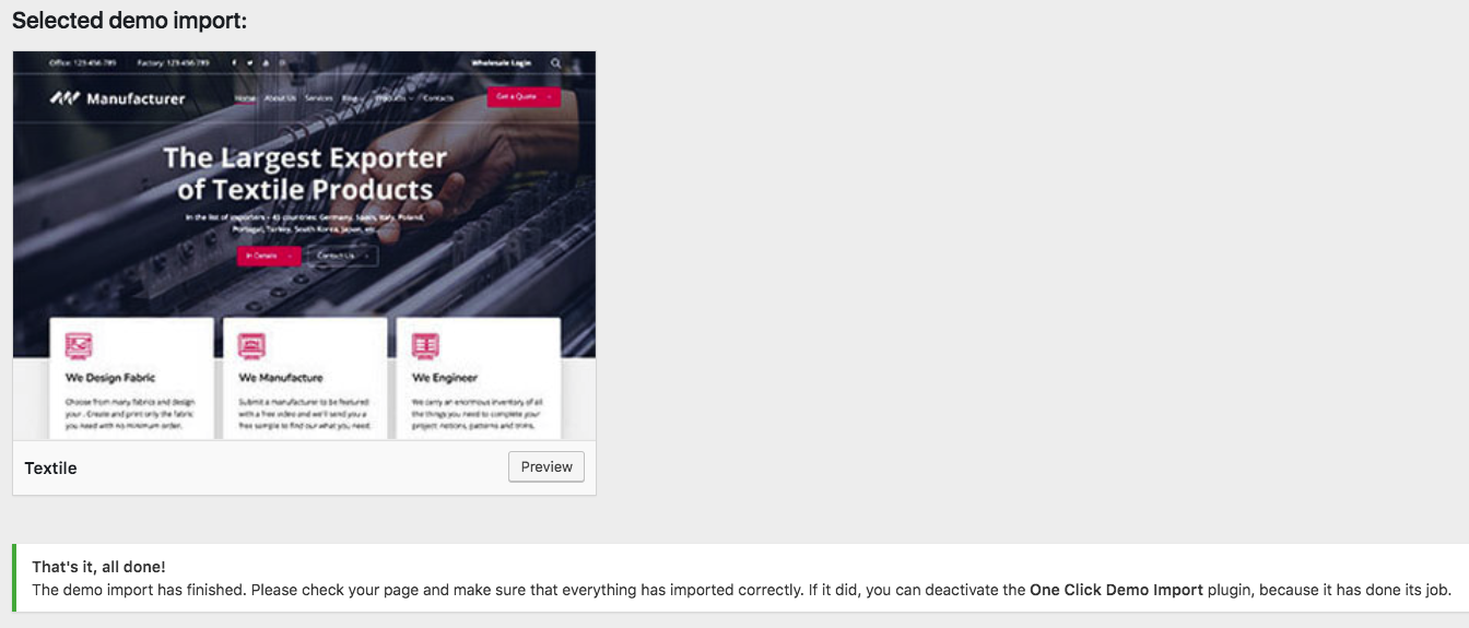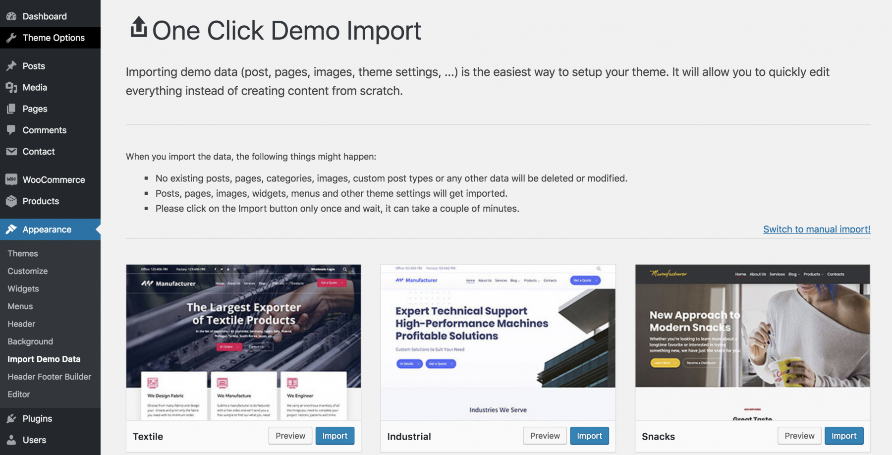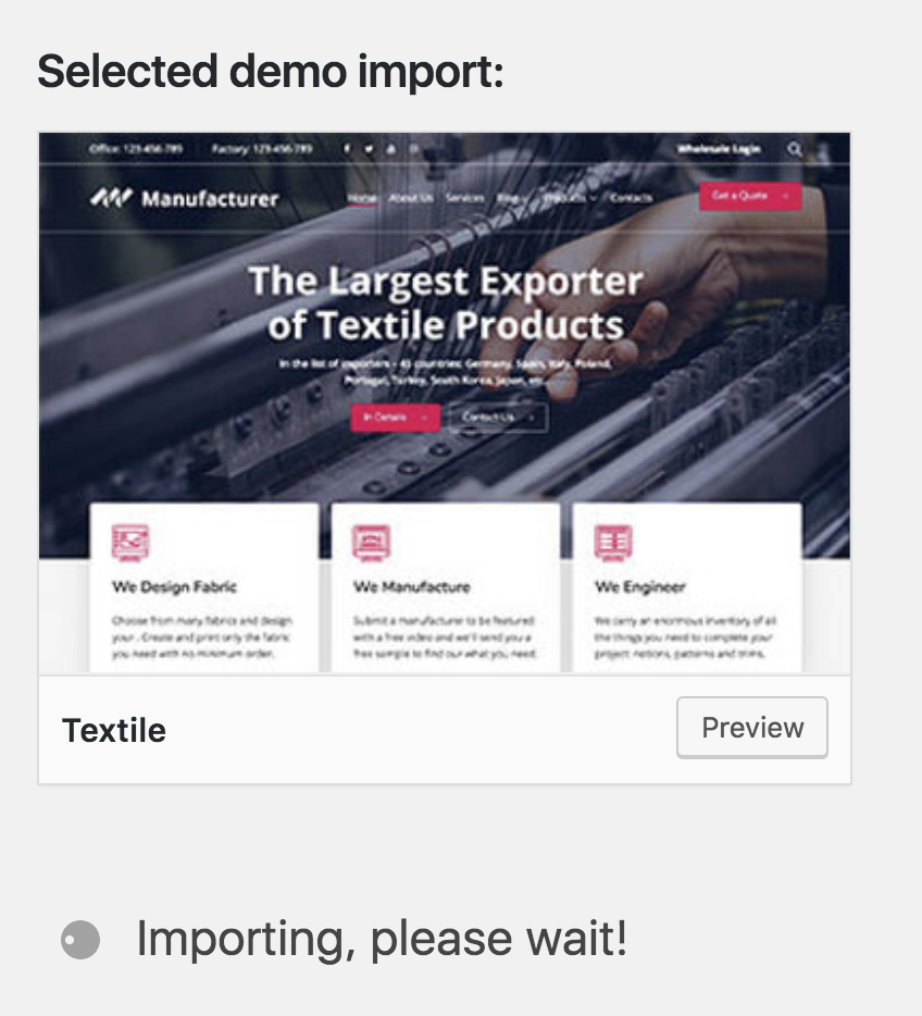 Tip: Before importing the demo content, you can check out the various demos at http://manufacturer.stylemixthemes.com/landing/. You can see the different demos and decide on which one suits your firm the best.