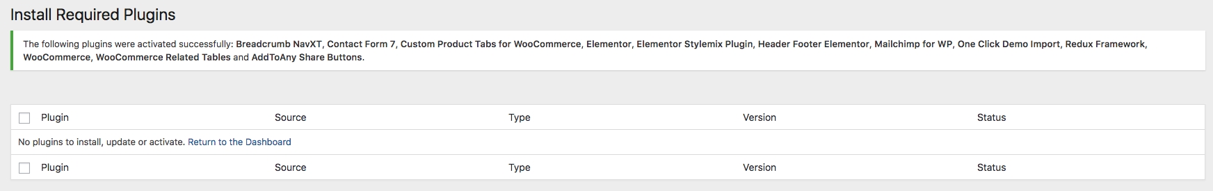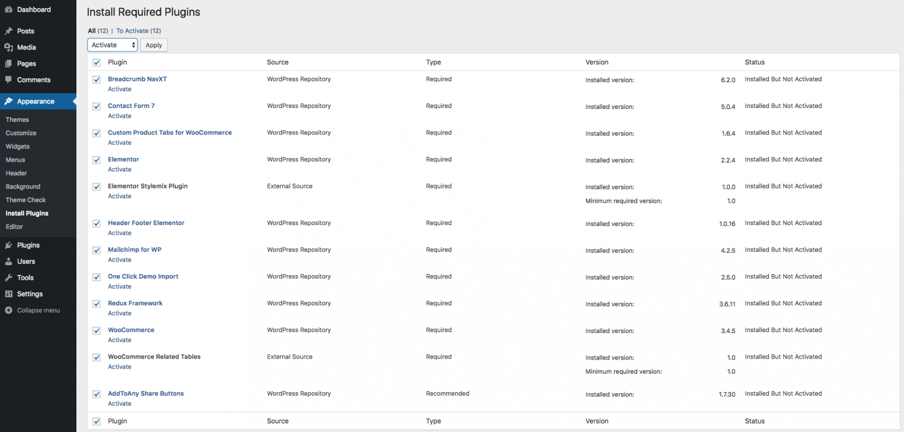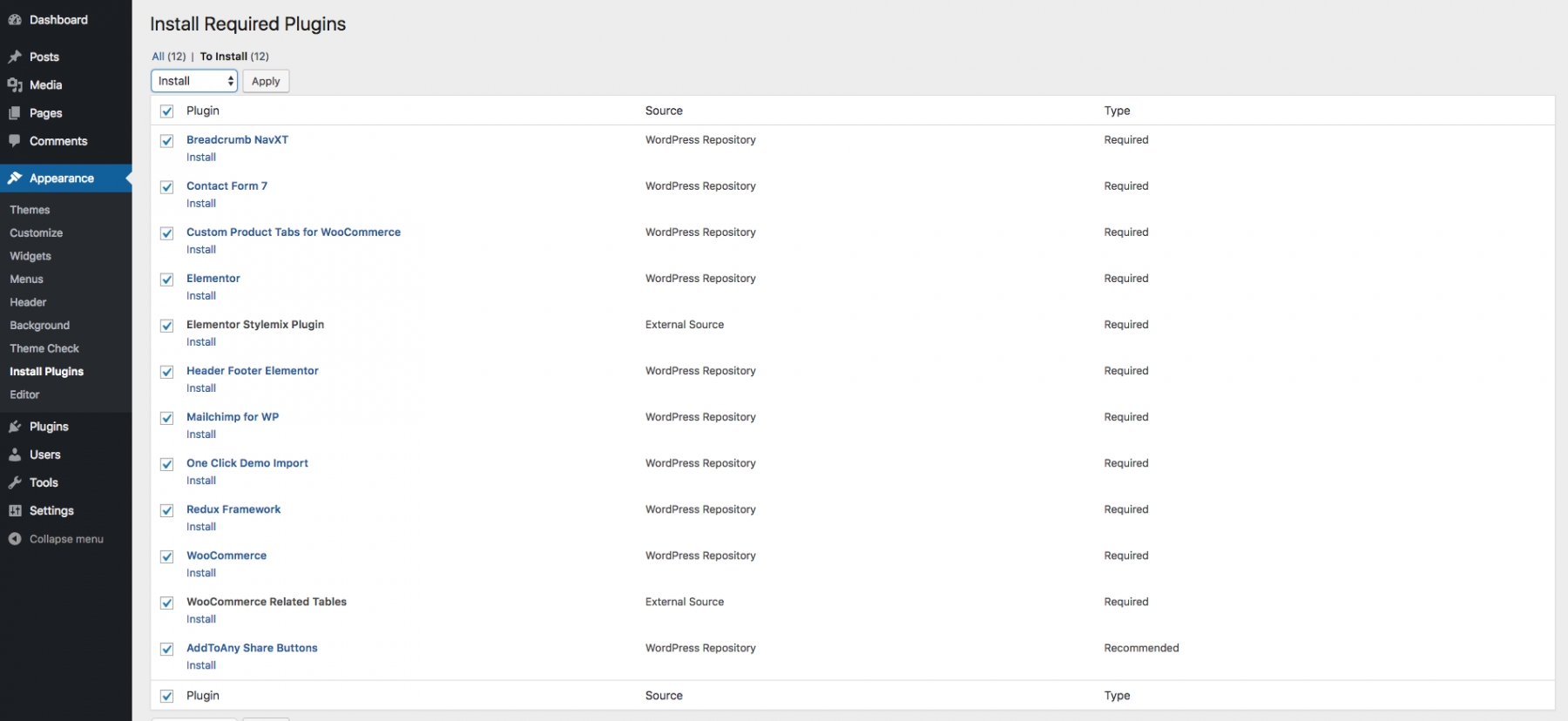 Once the theme is installed, you have to install all required plugins via Appearance > Install Plugins menu. Select All plugins and Install them via bulk Apply: