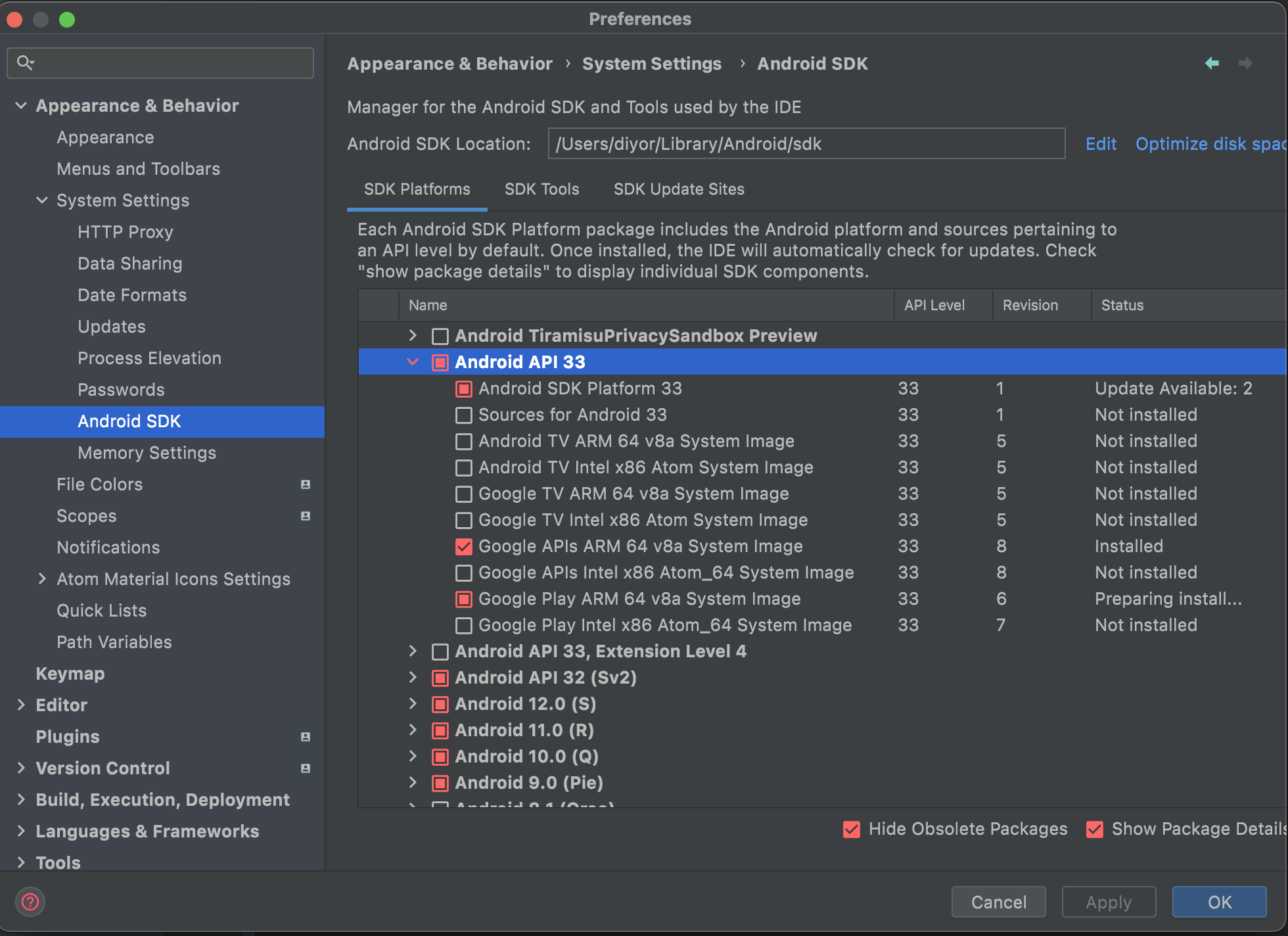 Go to the **Android Studio > Preferences > Appearance & Behavior > System Settings > Android SDK** and install the selected **SDK Platforms.**