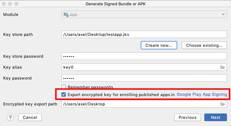 Next, check the Export encrypted key, if it is the update of the already uploaded app to the Google Play.
