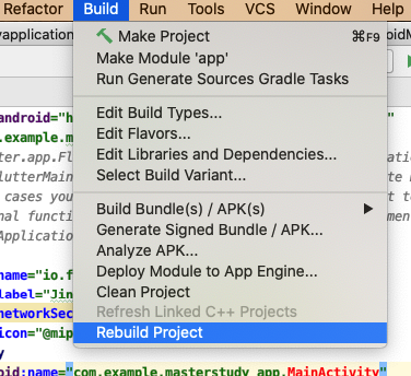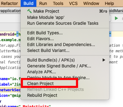 From the Android Studio menu open Build and click on the Clean Project. Wait until Android Studio finishes the process.