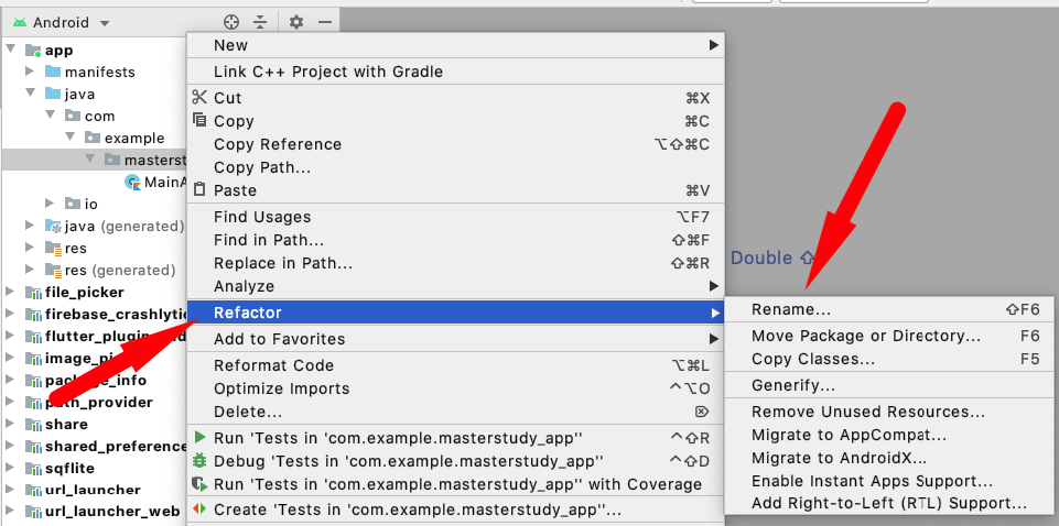 Note: When renaming com in Android Studio, it might give a warning. In such case, select Rename All.