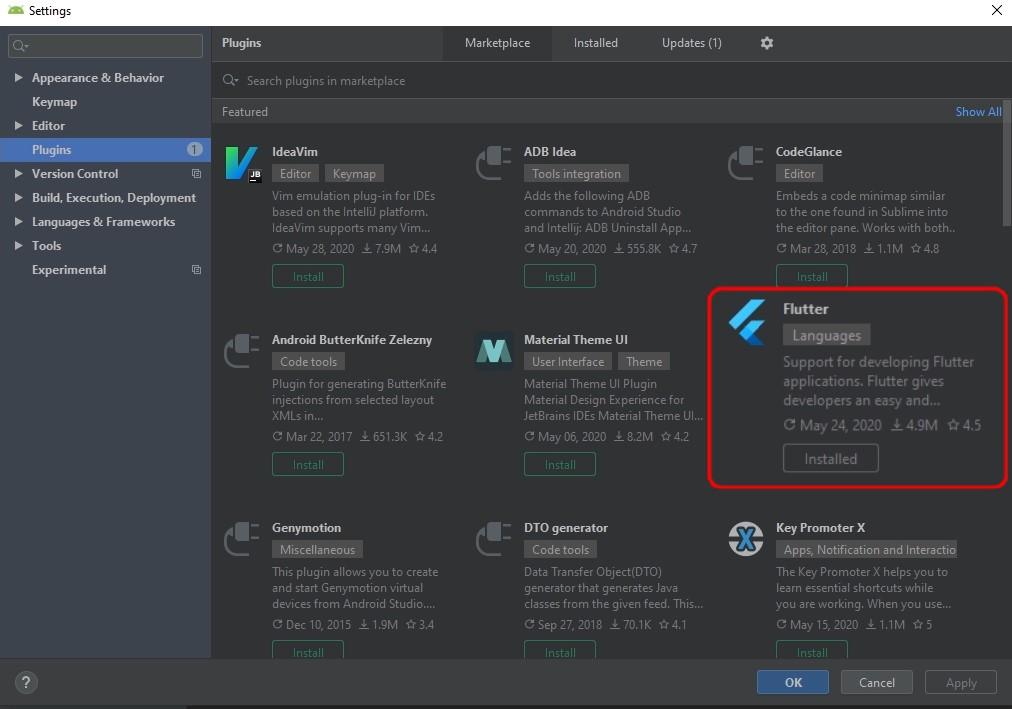 Now you need to install the Flutter plugin. Go to File > Settings > Plugin. Search for the Flutter plugin and click Install.
