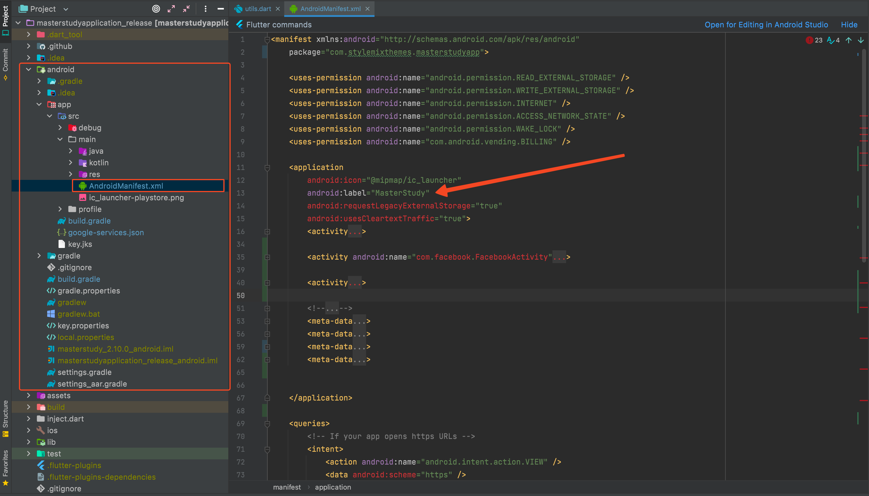 To add a name for your app, you need to edit the file called **AndroidManifest.xml**.