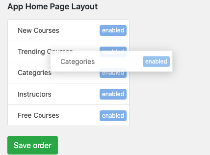 Among the settings you can find App Home Page Layout section where you can enable/disable sections and change their order on the front page by simply dragging them up/down.