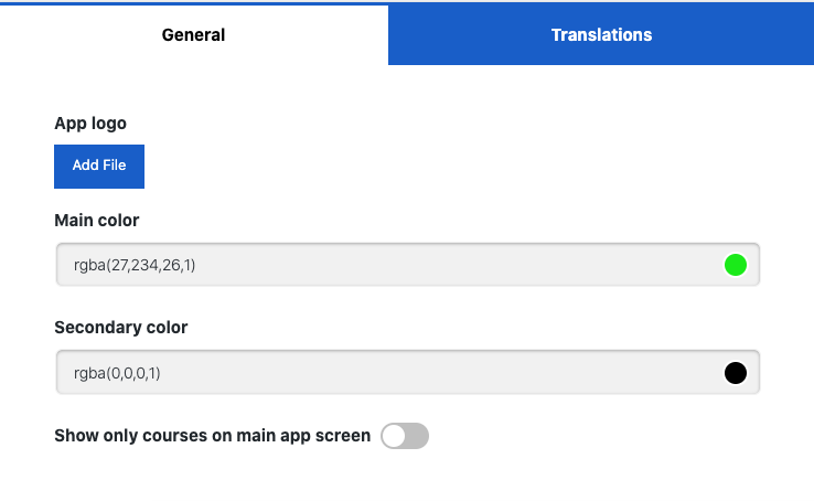 There are also settings you can find under the General Tab, where you can set logo, custom colors, enable/disable the list of the courses. If you enable the display of list of the courses, on the app main screen there will be only the courses list. If this option is disabled the main screen will include categories, popular, featured sections.