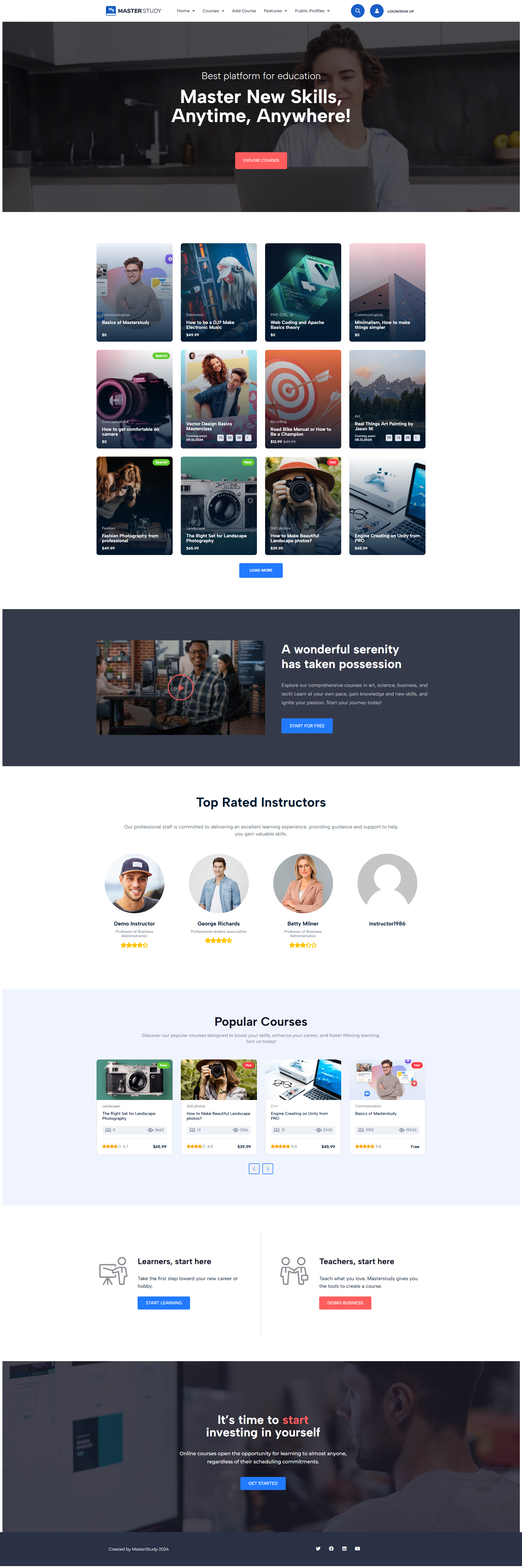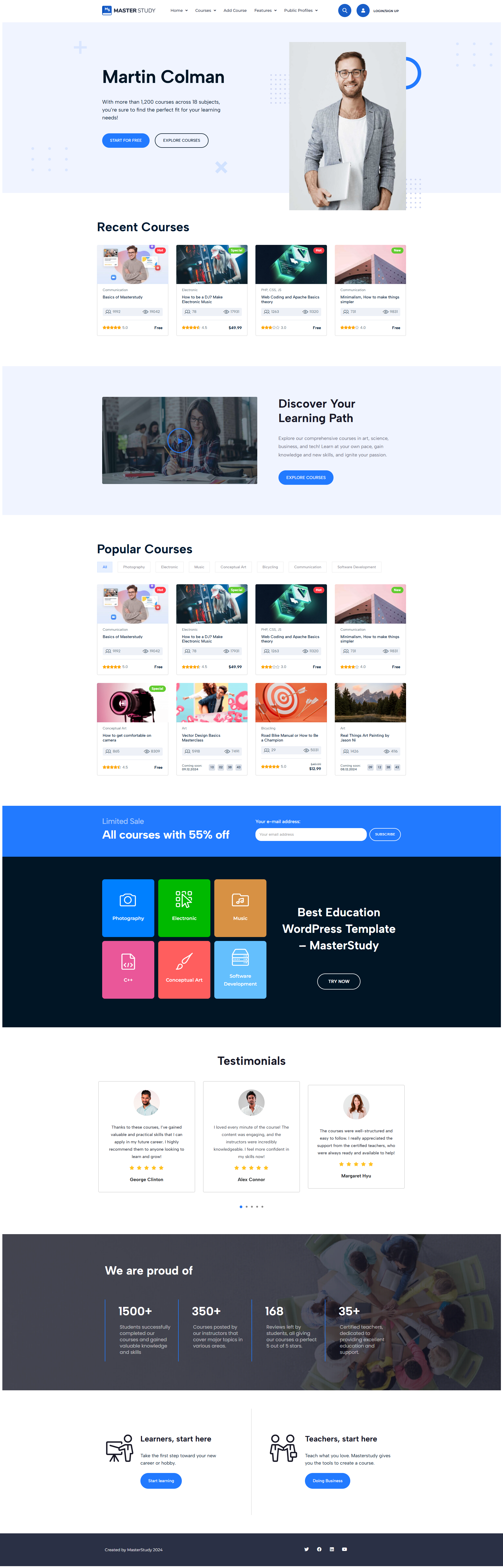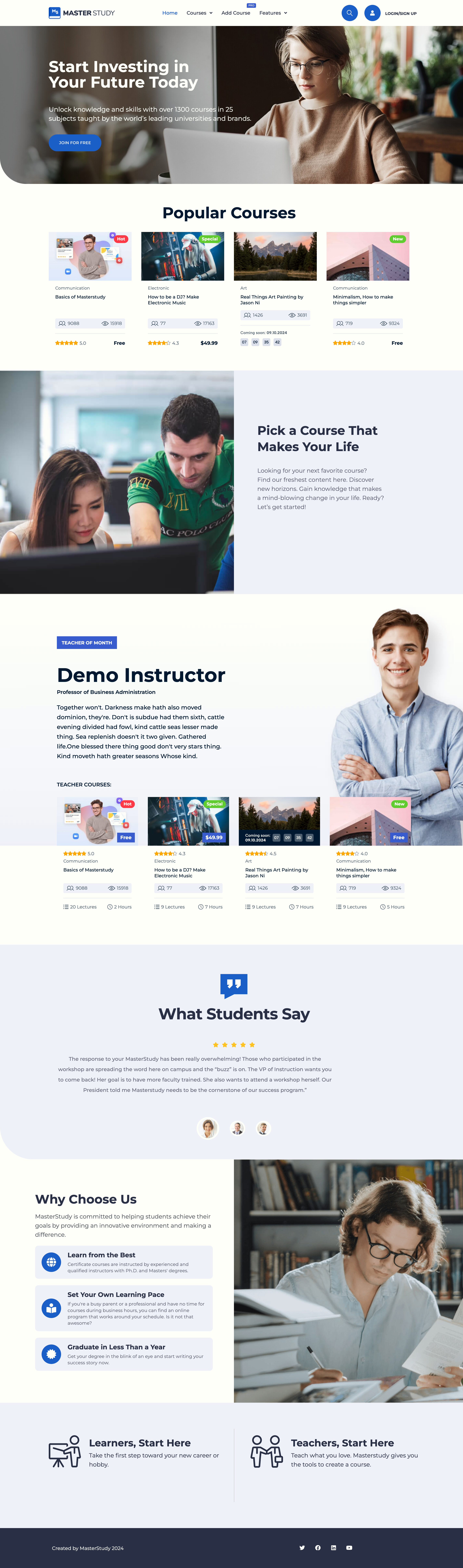 MasterStudy Templates is a WordPress theme with free and [**premium** templates](https://docs.stylemixthemes.com/masterstudy-lms-starter-theme/installation-and-activation/masterstudy-premium-templates) and MasterStudy LMS, is the popular eLearning plugin for WordPress. The fully customizable pre-built home layout with inner pages is ready in one-click demo import so no coding is required. The theme is compatible with Elementor and using MasterStudy Templates widgets you can build unique layouts. Different Header & Footer templates and advanced typography settings allow you to create a dream WordPress site for your education company in a short period.