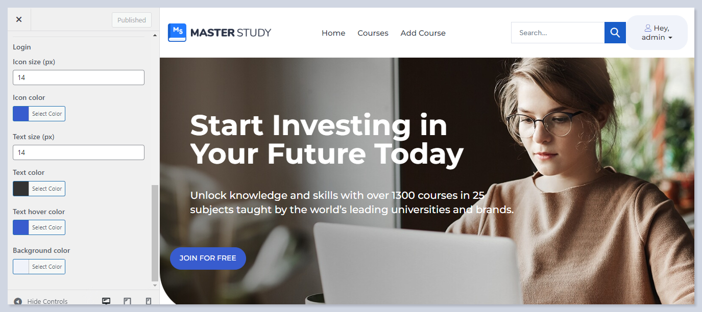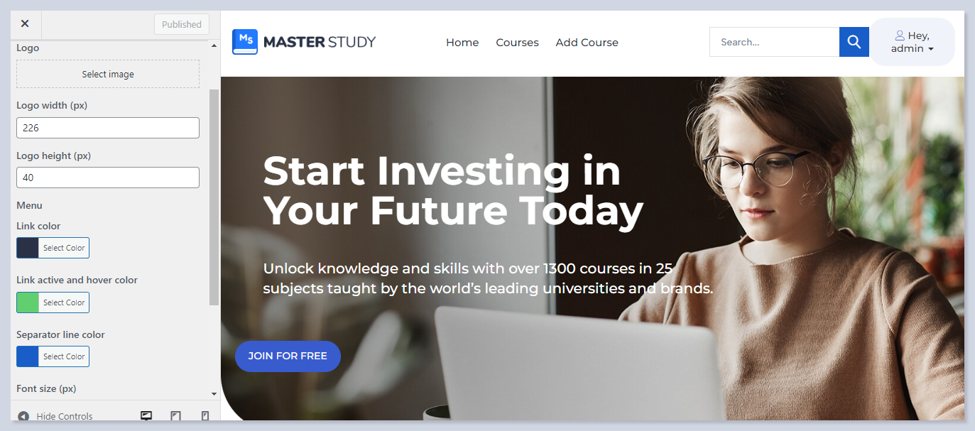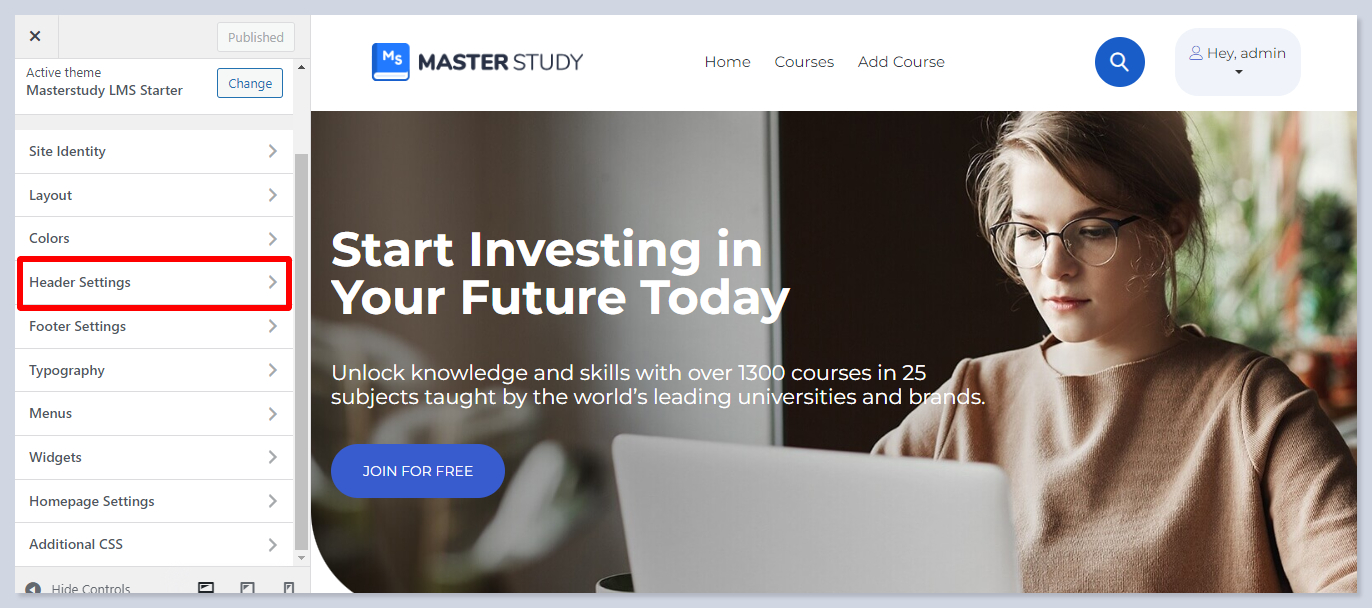 There are Header settings available in the Customize section of the Appearance menu in the WordPress dashboard or from your website page. These settings let you set up the visuals of the Header in the MasterStudy Templates.
