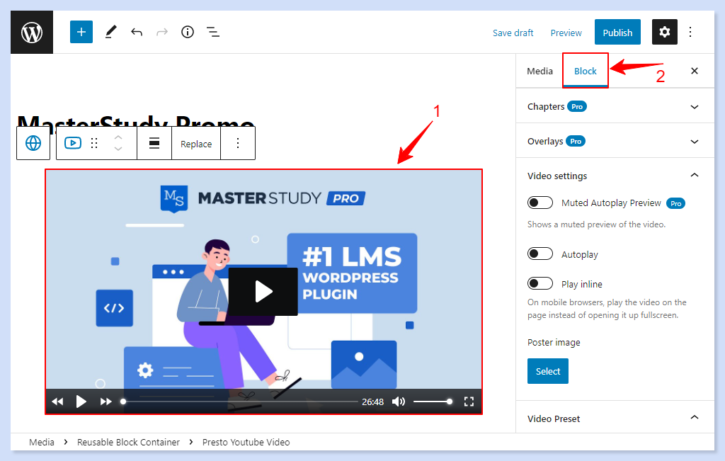 **Step 4** – Once the video is loaded, you can adjust the block settings:&#x20;