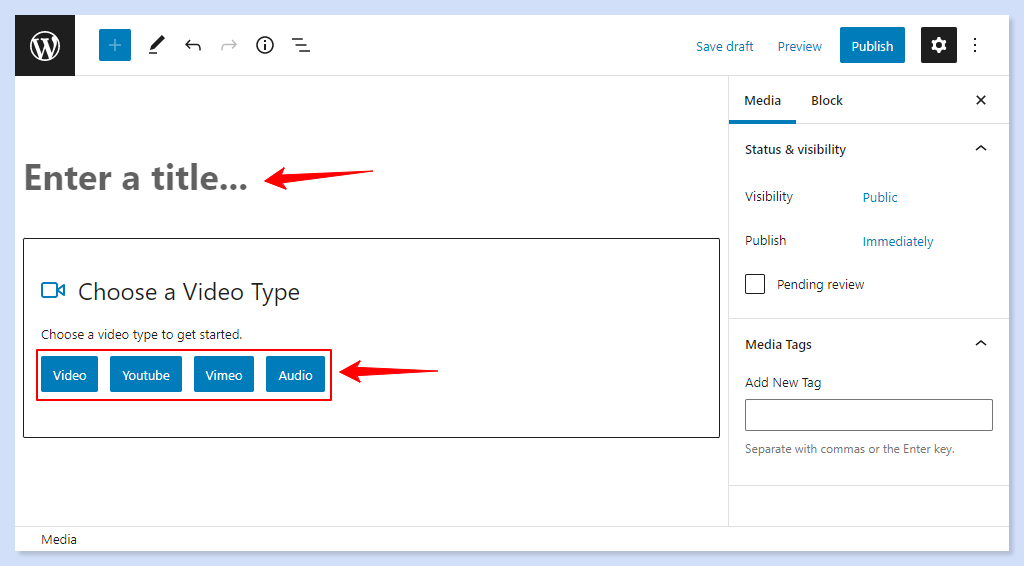 **Step 2** – Next, select the video type based on where you want to store your video. Thus, you can choose from four different options: (self-hosted) Video, YouTube, and Vimeo. If you have Prest Player Pro activated on your website, you will also see the Bunny.net option:
