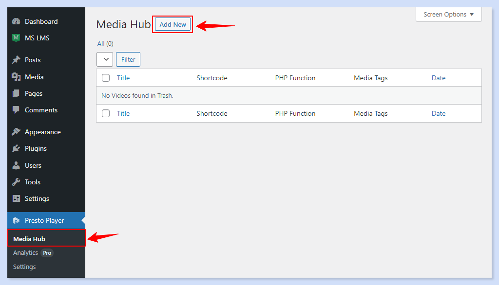 **Step 1** – Navigate to Dashboard > Presto Player > Media Hub. Here, click on the “**Add New**” button, and give your video a name: