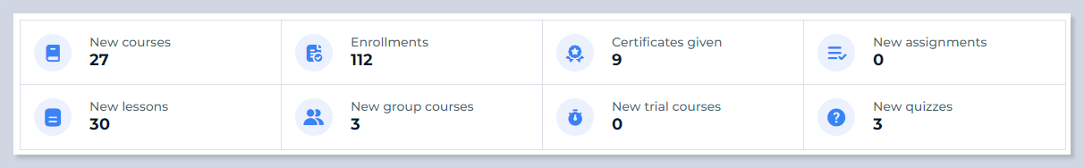 * **New Lessons -** The total number of new [**lessons**](https://docs.stylemixthemes.com/masterstudy-lms/lms-course-features/lessons) added to courses.