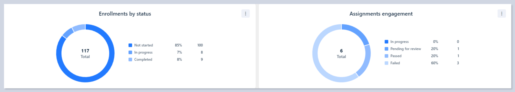 <figure><img src="https://691205473-files.gitbook.io/~/files/v0/b/gitbook-x-prod.appspot.com/o/spaces%2F-MDTL6WUldKvxQaP8jzz%2Fuploads%2FVYanIBJ5ORwkjDcsqrXp%2Fimage.png?alt=media&#x26;token=badd7030-04dd-4316-b7b5-8416f4d519e0" alt=""><figcaption><p>Enrollments by Status and Assignments Engagement Pie Charts</p></figcaption></figure>
