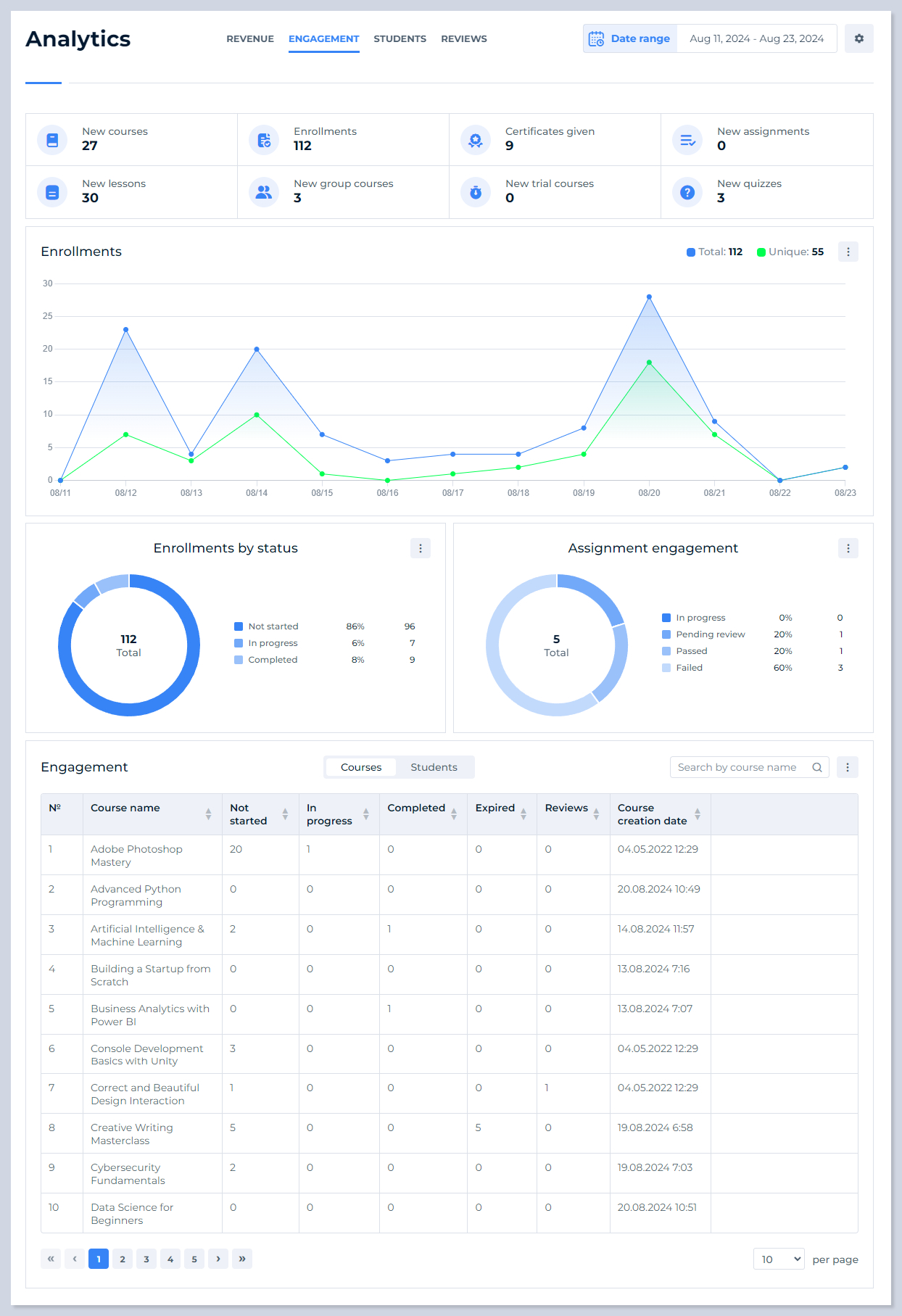**The Engagement** tab provides a comprehensive overview of how students are interacting with the instructor's content. It tracks key engagement metrics like enrollments, course progress, and assignment completion, giving valuable insights into student behavior and course effectiveness. This data helps identify areas where students are engaged or struggling, enabling targeted interventions to improve learning outcomes.