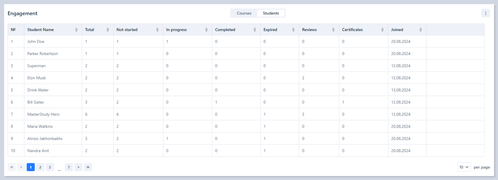 The Engagement table for students provides a detailed overview of individual student activity and progress across courses.