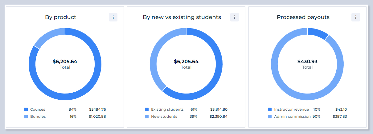 <figure><img src="https://691205473-files.gitbook.io/~/files/v0/b/gitbook-x-prod.appspot.com/o/spaces%2F-MDTL6WUldKvxQaP8jzz%2Fuploads%2F098mmKkfQ1NqwOKr9leC%2Fimage.png?alt=media&#x26;token=067e22d9-564f-45cd-8939-771e5106d0b3" alt=""><figcaption><p>Pie Charts to illustrate Earning by Product, New or Existing Students, and Payouts </p></figcaption></figure>