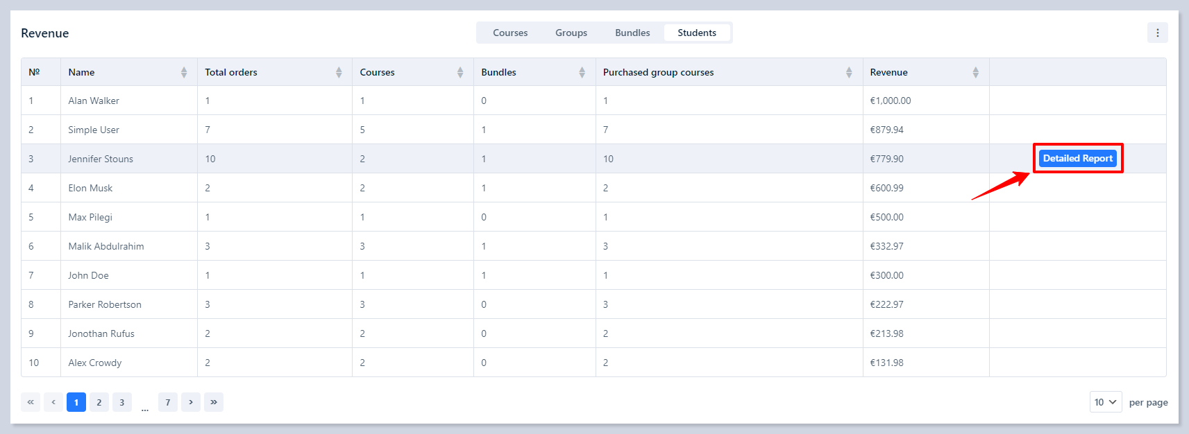 **Revenue Breakdown by Students:** This table in the Revenue tab provides a breakdown of revenue generated by individual students. It highlights which students are the most valuable in terms of revenue.
