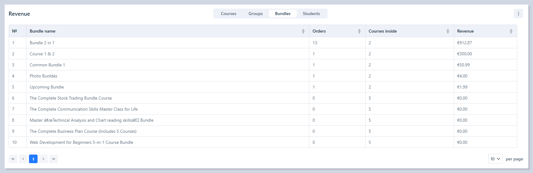 **Revenue Breakdown by** [**Course Bundles:**](https://docs.stylemixthemes.com/masterstudy-lms/lms-pro-addons/course-bundles) This table helps users quickly assess the financial performance of different course bundles. It highlights which bundles are driving the most sales and revenue.