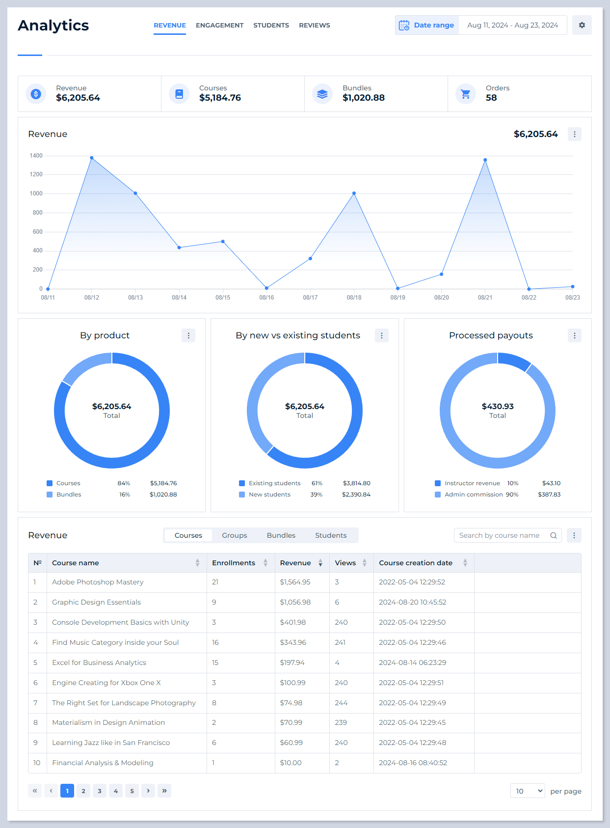 **The revenue** tab offers a summary of instructors' financials, covering total revenue, orders, and membership sales. Visuals include trend graphs, pie charts, and revenue breakdowns by-products and students. It also tracks payouts and platform commissions. Detailed tables enable in-depth analysis of the course, group, bundle, and students, helping to monitor performance and spot revenue trends.