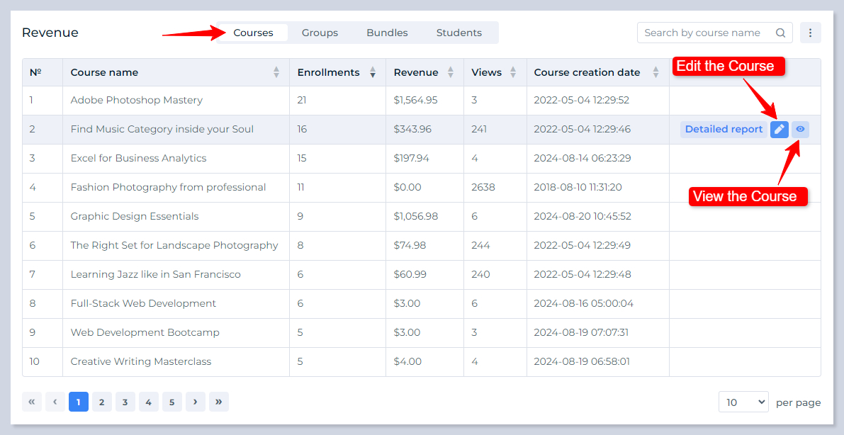 **Revenue Breakdown by Course**: Lists individual courses along with enrollment numbers, total revenue, views, and course creation dates.&#x20;