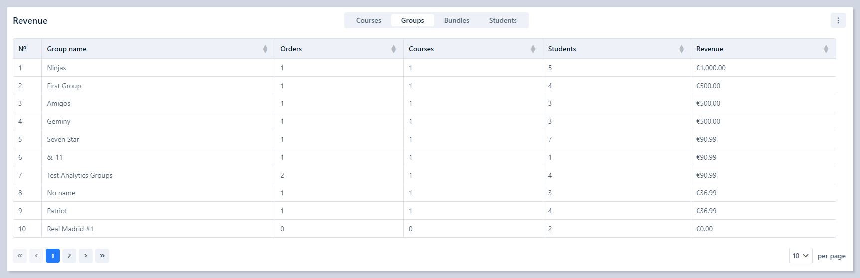 **Revenue Breakdown by** [**Groups**](https://docs.stylemixthemes.com/masterstudy-lms/lms-pro-addons/group-courses)**:** The table in the Revenue tab provides a detailed breakdown of revenue generated by different groups.&#x20;