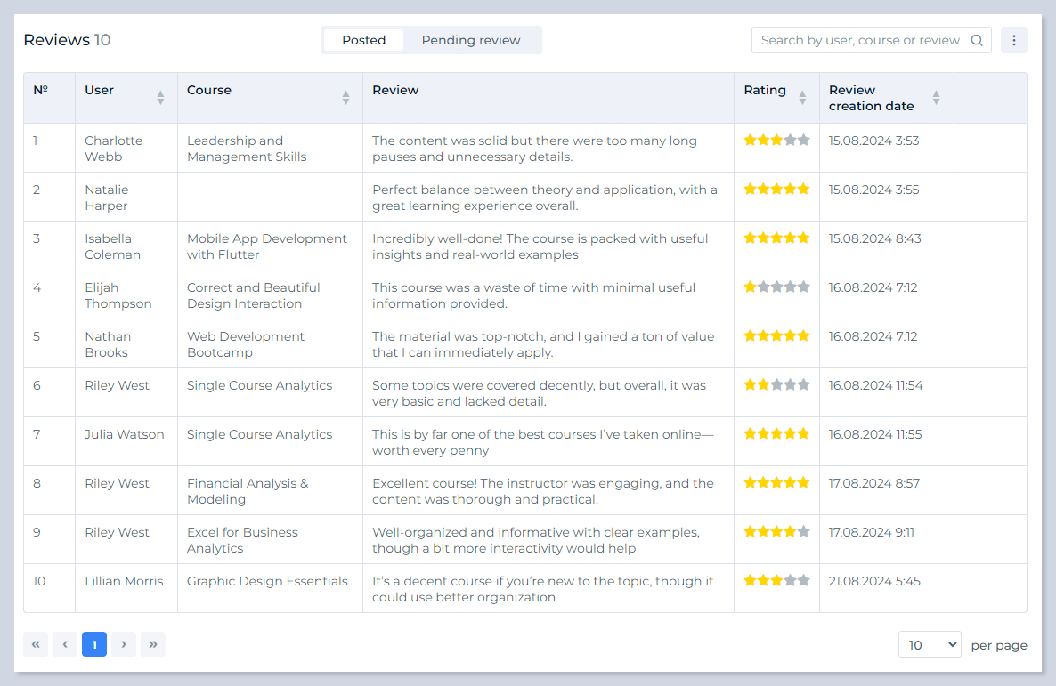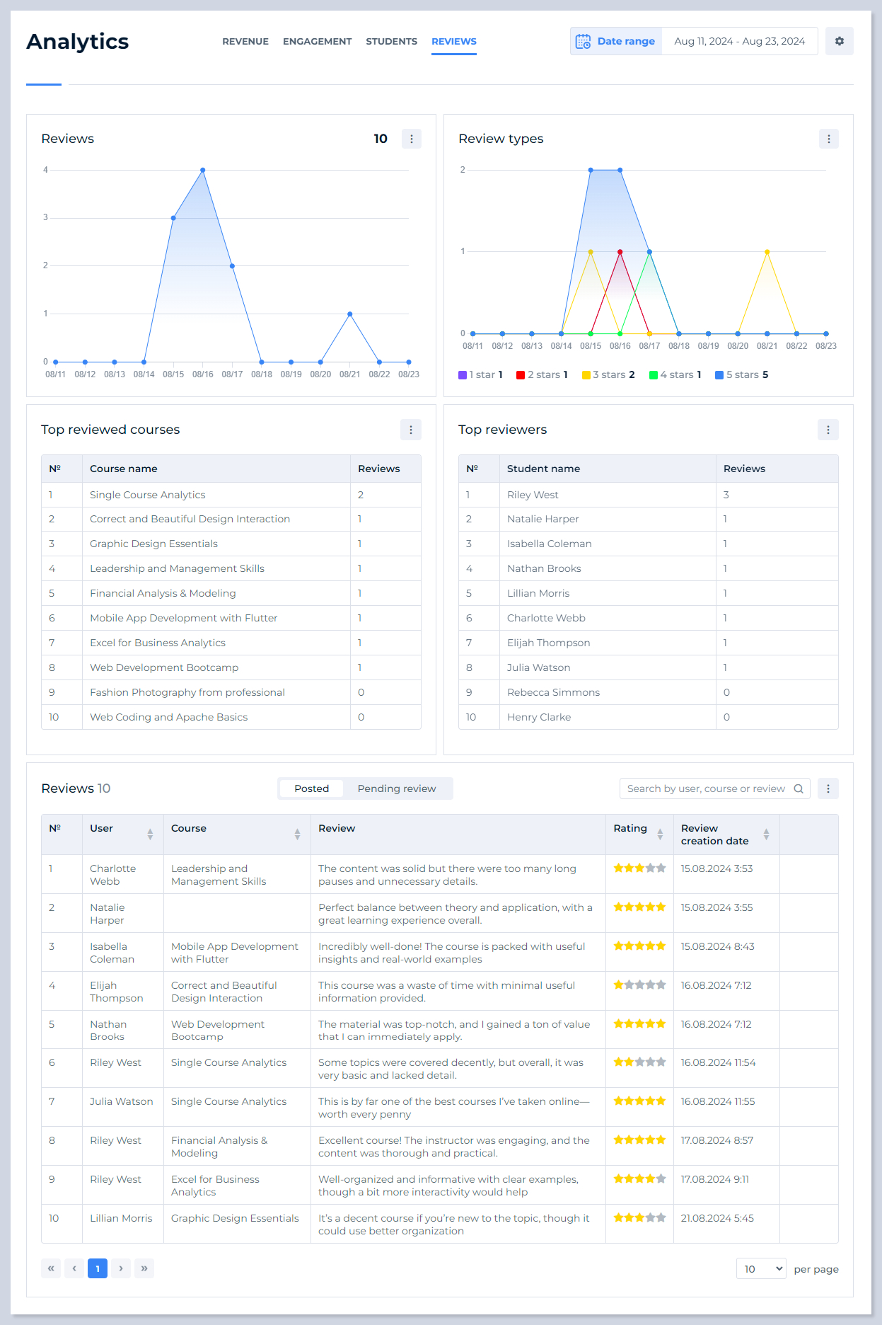The **Reviews** tab provides an in-depth look at user feedback across courses, with tools to analyze trends, track top reviewers, and manage review content. The combination of visual graphs and detailed tables allows administrators to monitor the quality of courses, identify areas for improvement, and recognize highly engaged users. The data is sorted and categorized in a way that makes it easy to understand the overall sentiment and prioritize course enhancements.