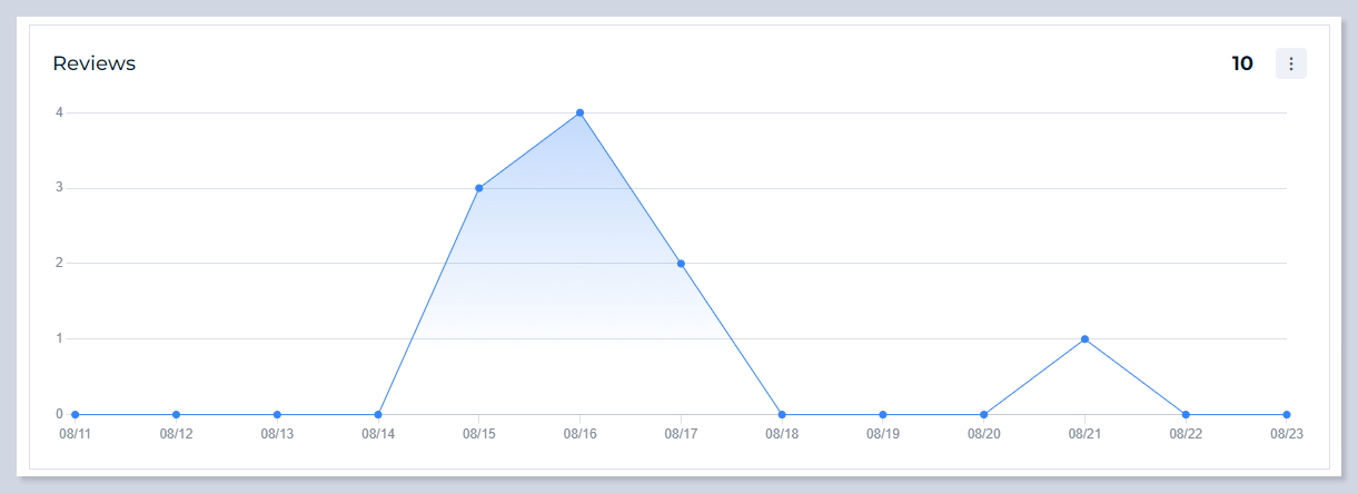 This line graph displays the total number of reviews submitted over the selected date range. Peaks indicate days with higher review activity, while drops show lower engagement.