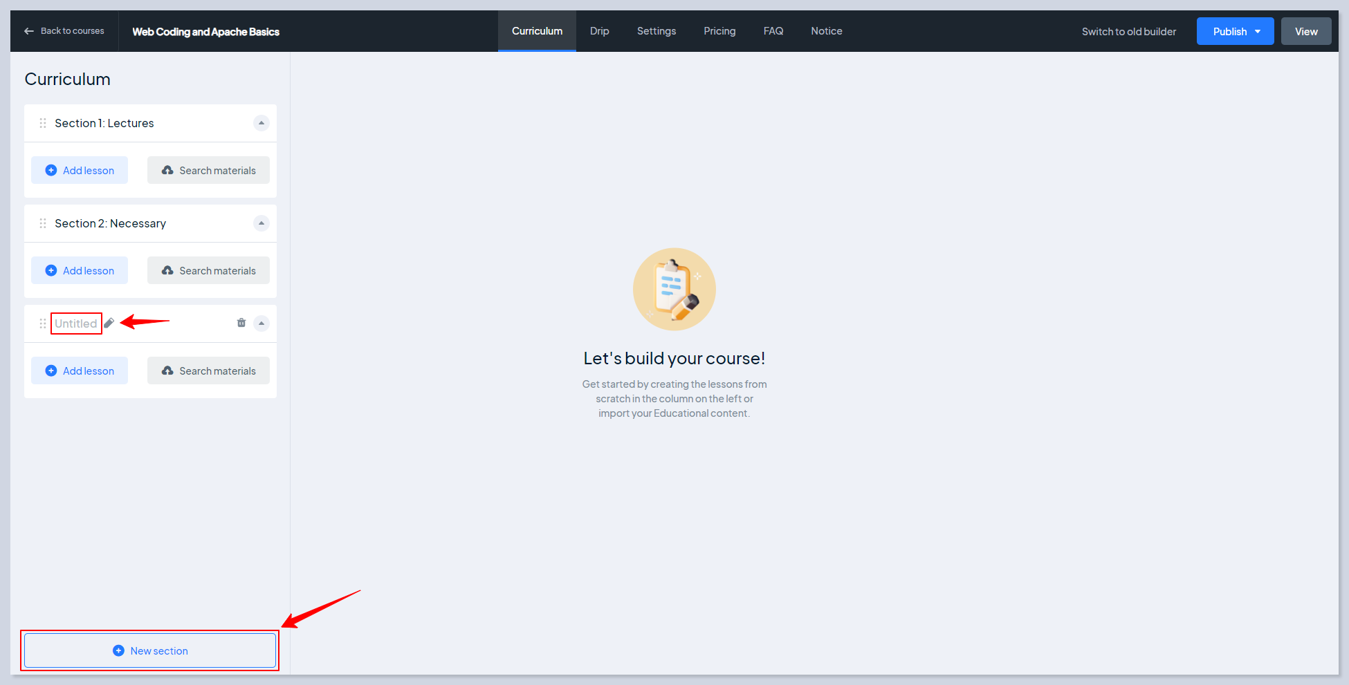 A curriculum is a collection of lessons and assessments that will be taught by an instructor. As soon as a new course is created on the left side of the screen course curriculum section appears.