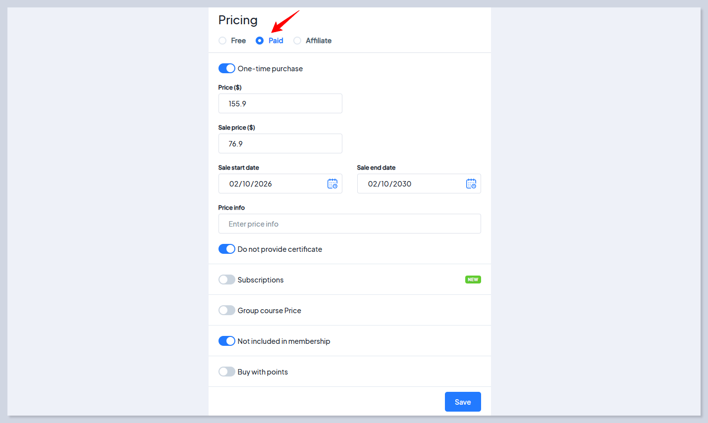 * **One-time purchase** - Enables a single payment model that grants lifetime access. Enter the number in the blank to set the course price, or leave the field empty to make the course free.