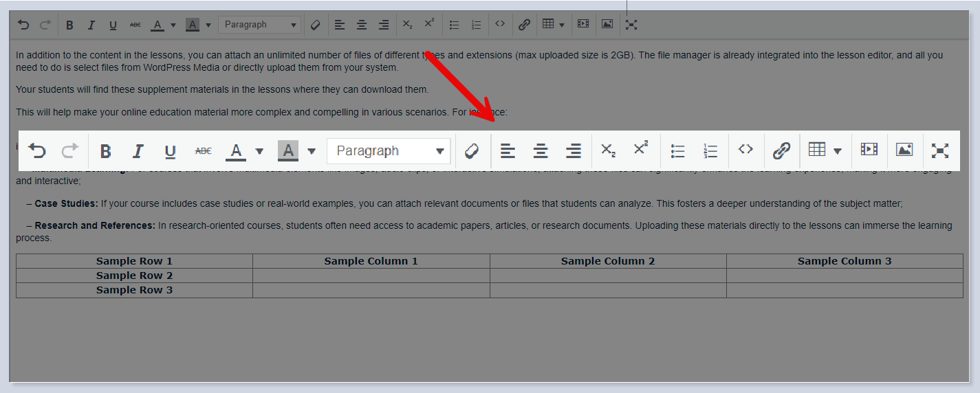 * **Media Gallery** - opens[ **Media File Manager**](https://docs.stylemixthemes.com/masterstudy-lms/lms-pro-addons/media-file-manager) to insert audio/video/image&#x20;