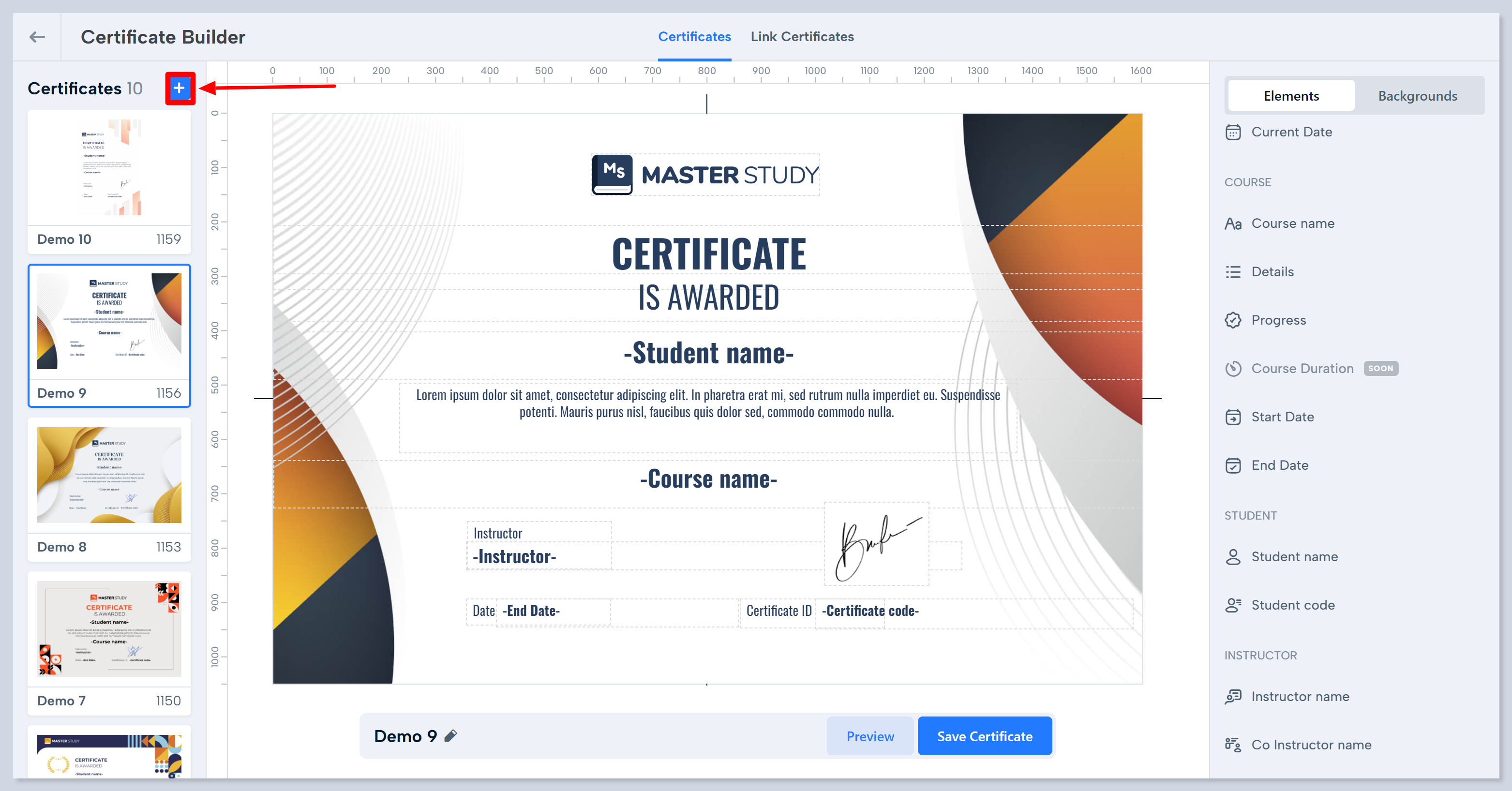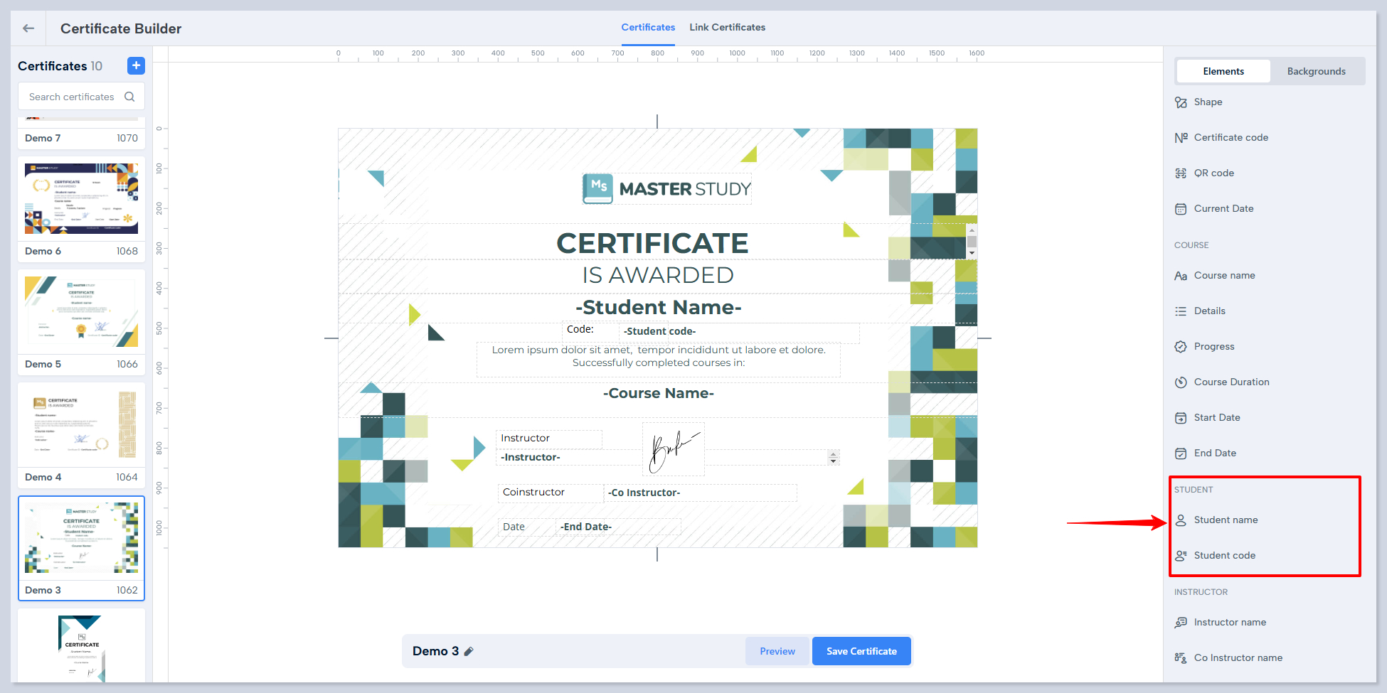 9. Click on the element and place these elements as desired within the Certificate builder.