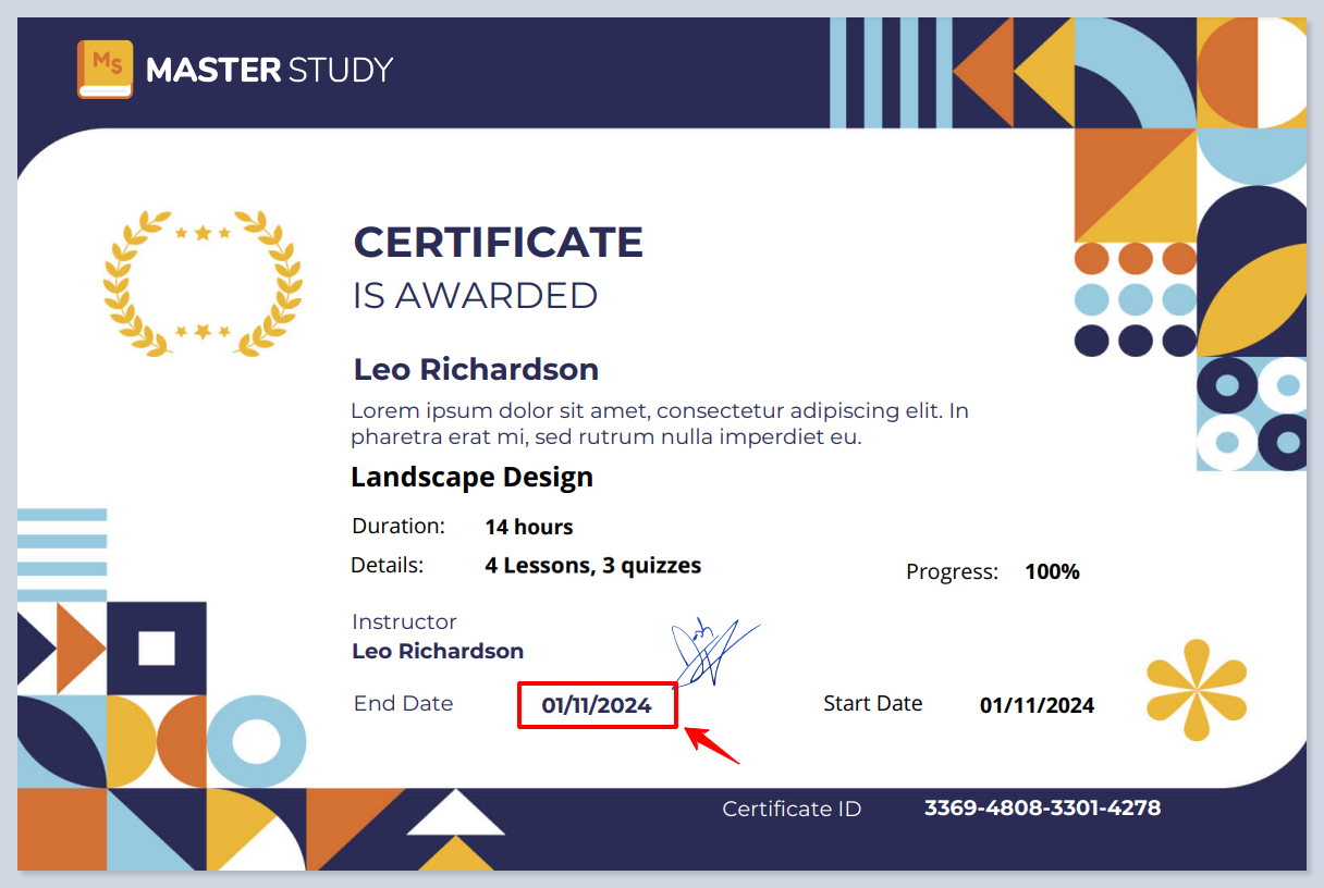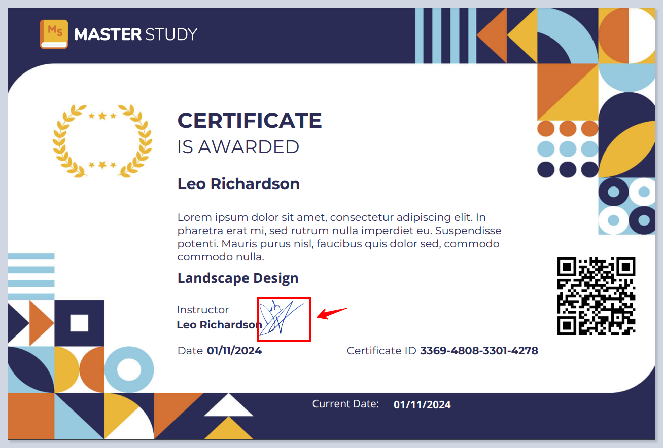**The Current Date** element displays the date when the certificate is issued. This is essential for marking when the course is completed and the certificate awarded. It updates automatically, ensuring each issued certificate reflects the correct date.