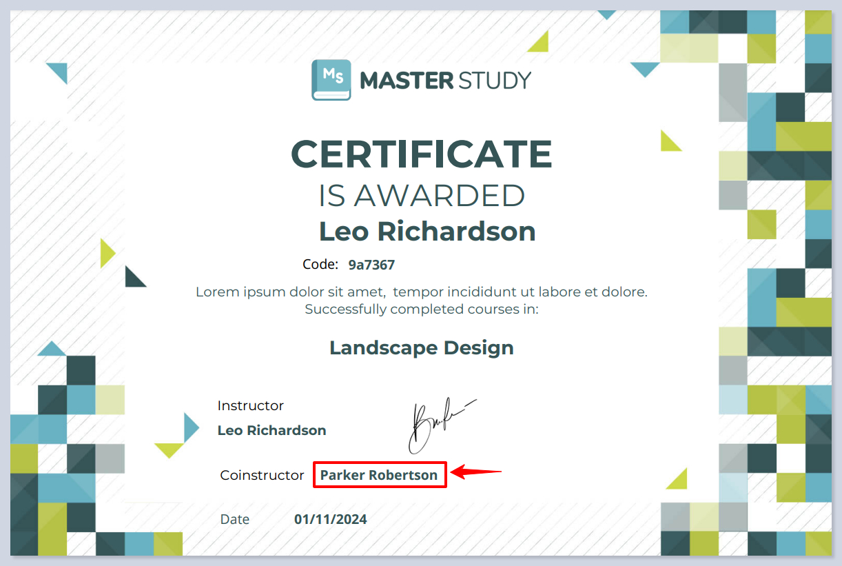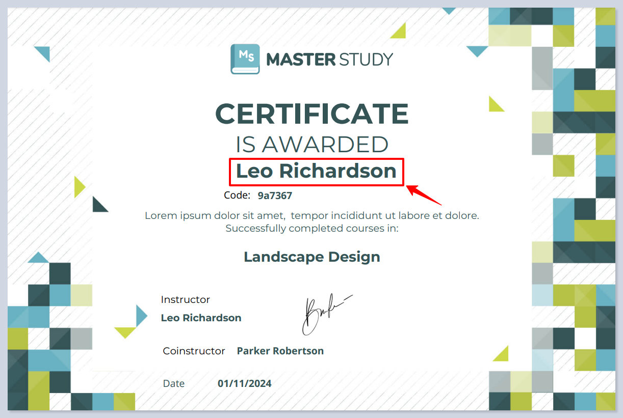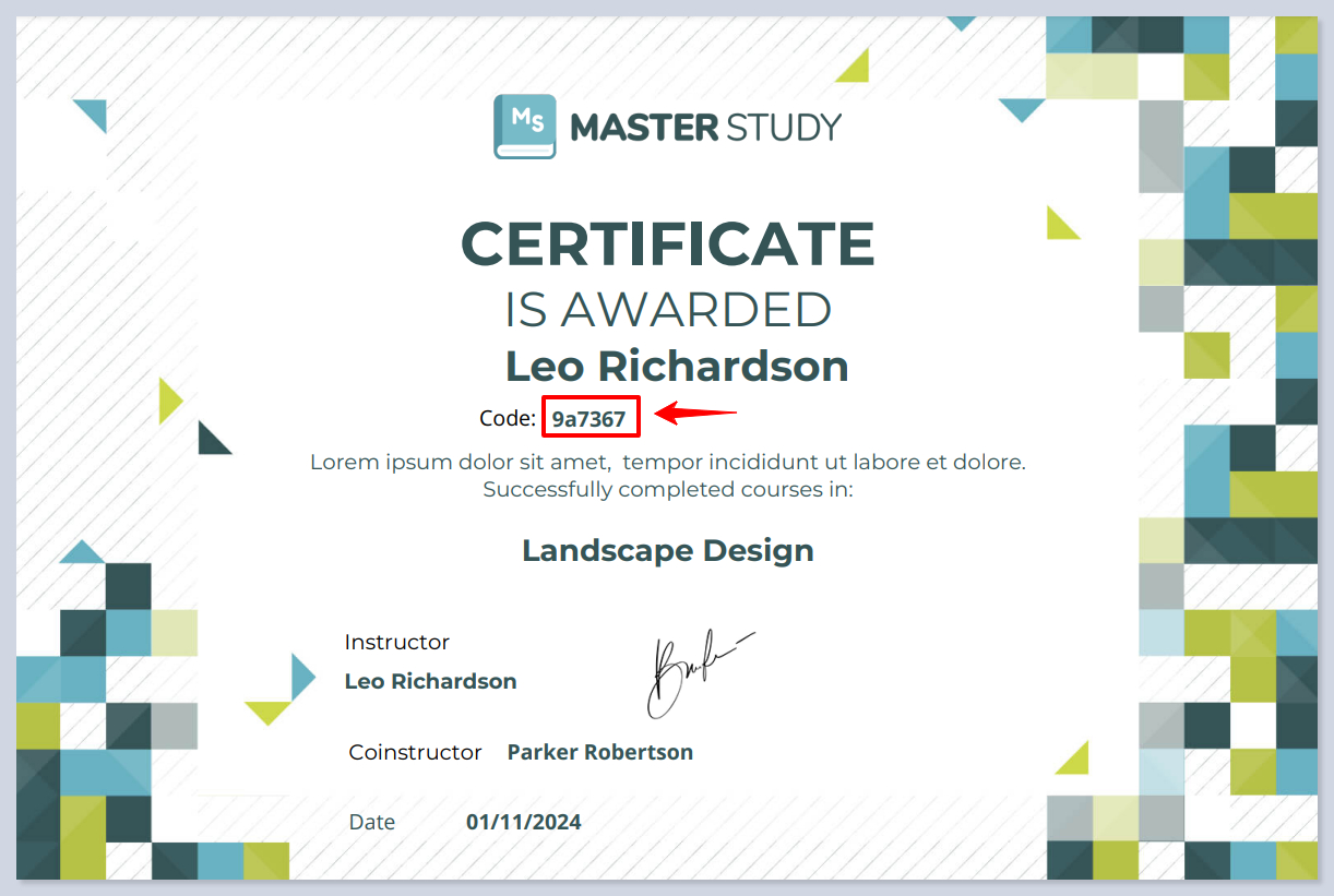 **The Certificate Code** element is used to display a unique, auto-generated code on each certificate. This code serves as an identifier for verification purposes and ensures that each certificate issued is distinguishable and trackable.