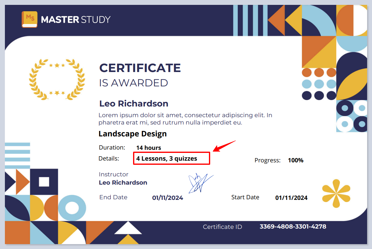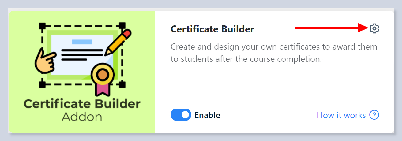 The Certificate Builder addon lets you make and design your own certificates. These are given to students when they finish their course.