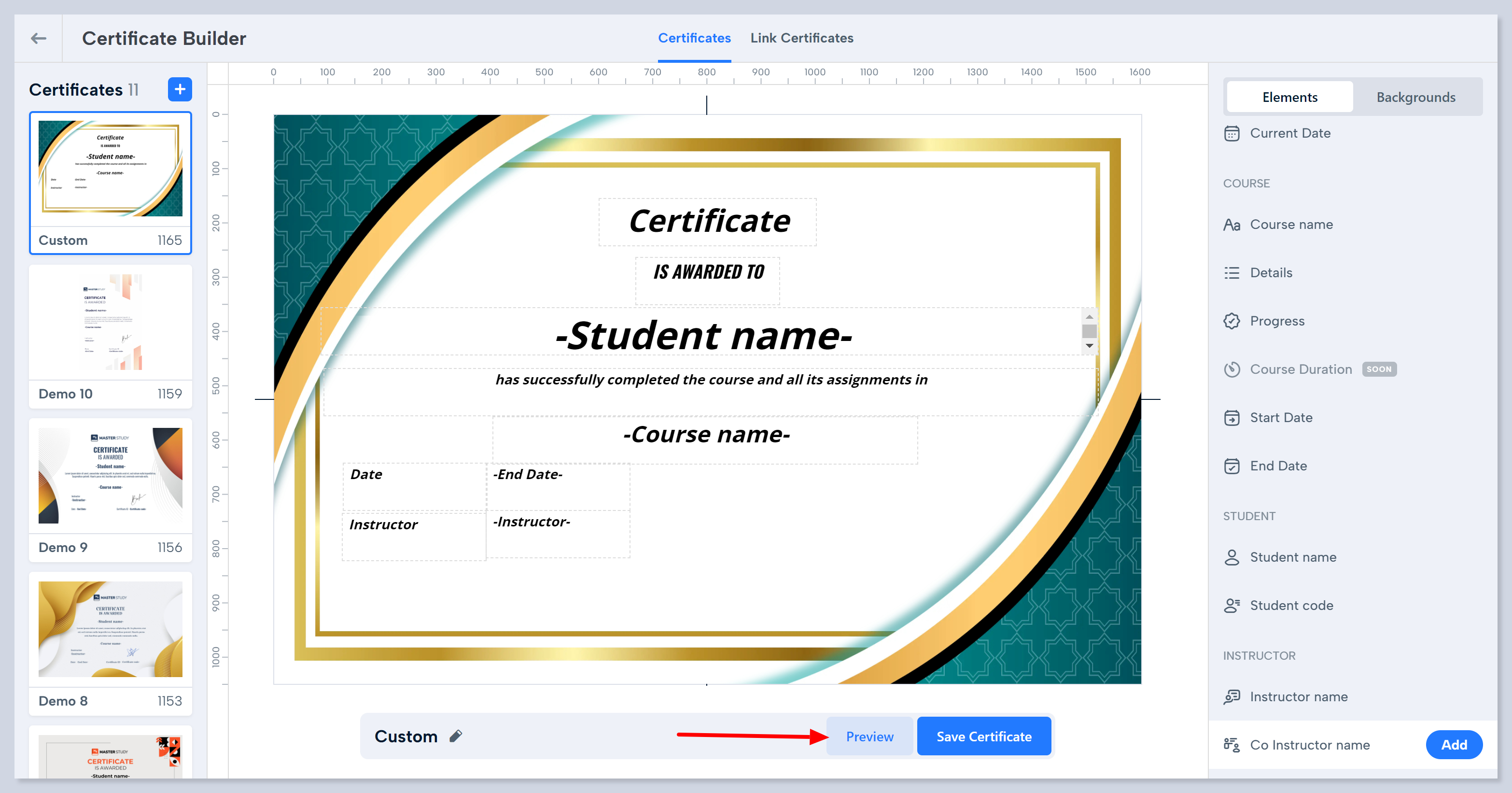 12. After saving, use the preview button to view your newly created certificate.