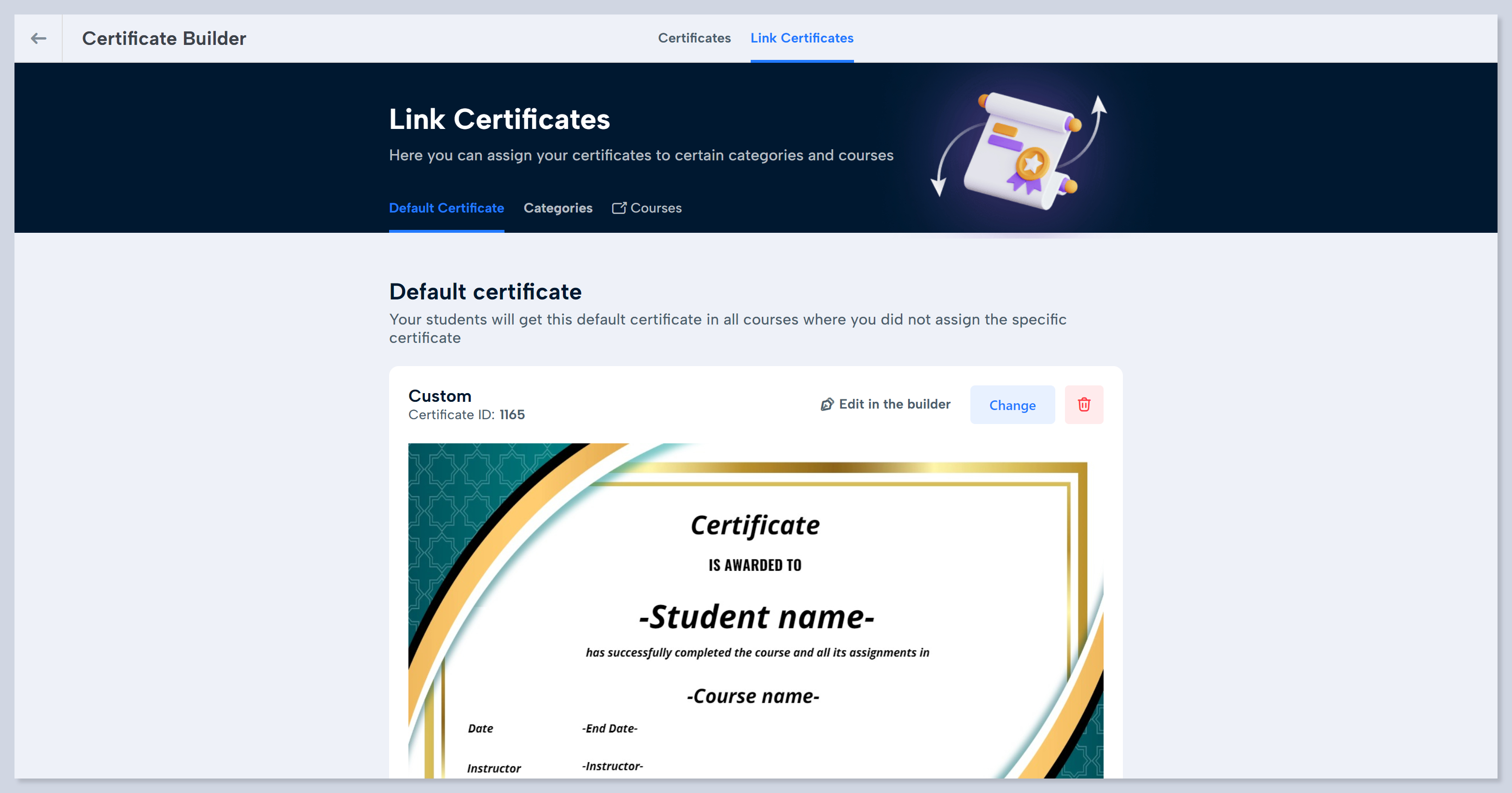Instructors can link the certificates to their courses from the respective tab of the Course Builder: