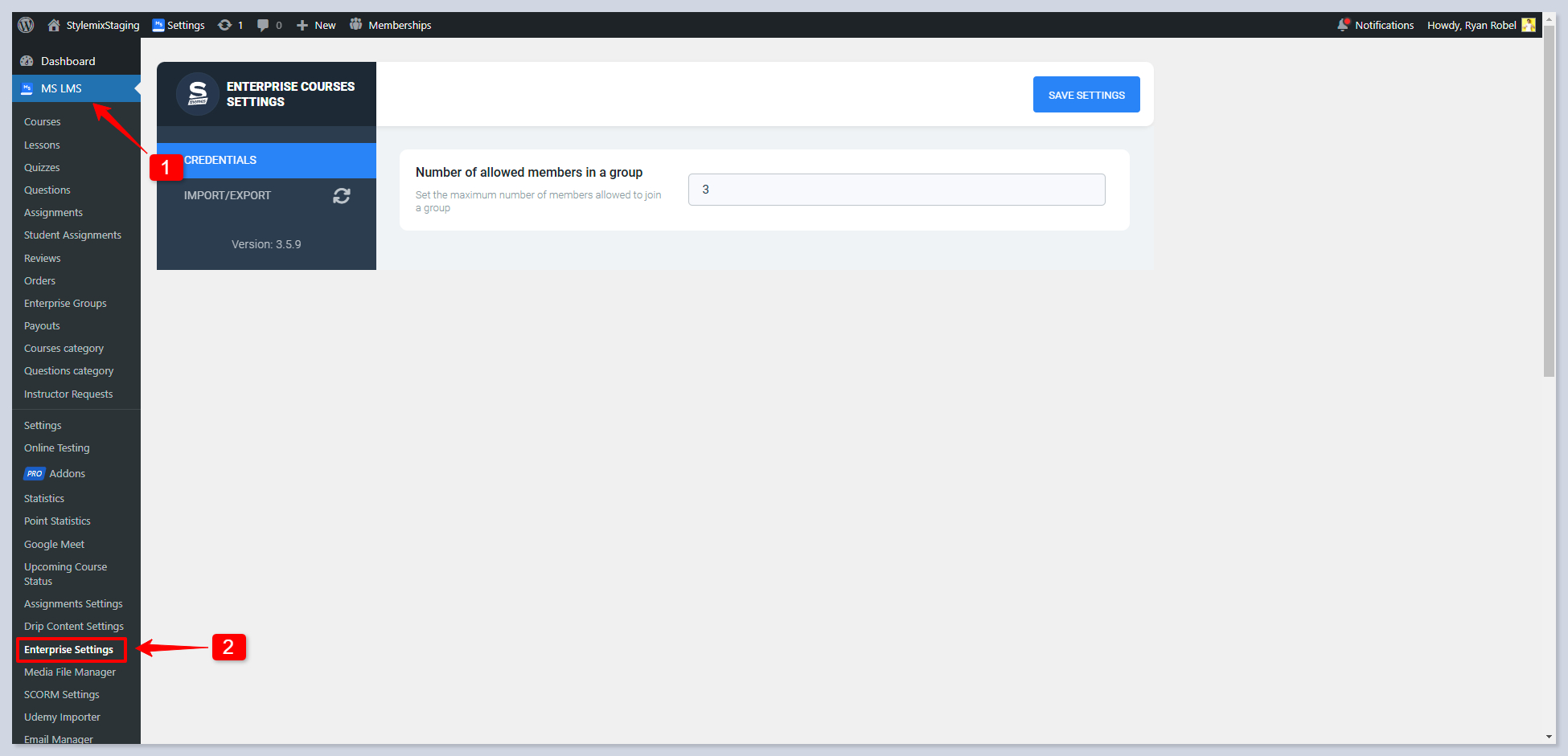 To open the add-on settings, click on the gear icon in the Group Courses addon in the pro addons page or follow **MS LMS > Enterprise Courses:**
