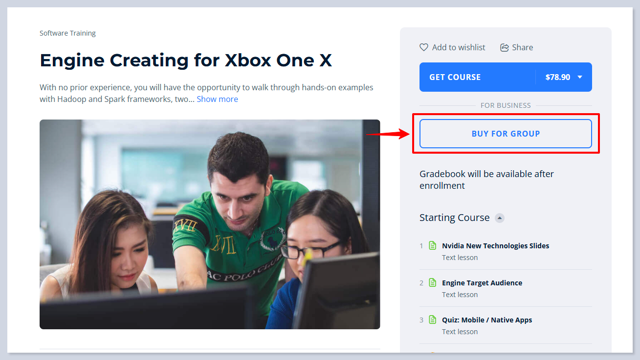 Now on **the course page**, there will be a button that enables you to buy it for a group: