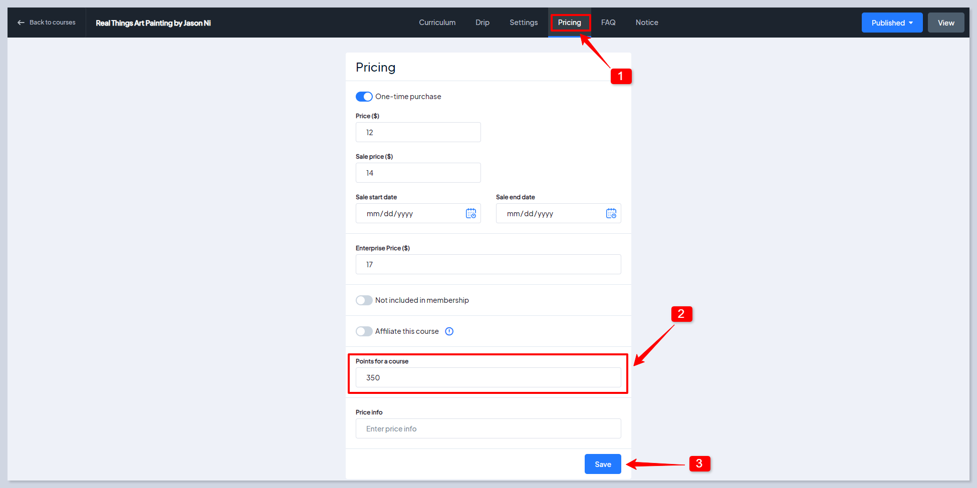 2. Move to the Pricing and indicate the course price in terms of Points, save the changes.