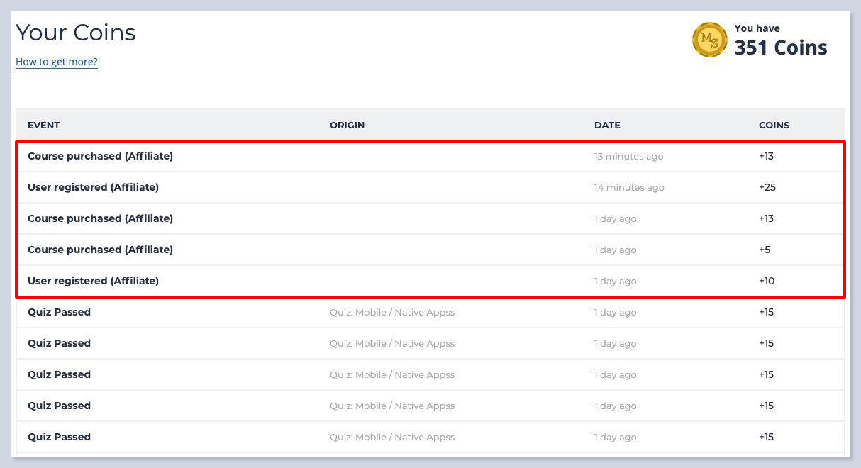 * **User Registered (Affiliate)** - Set the points given to students for registering on your platform through an affiliate link.