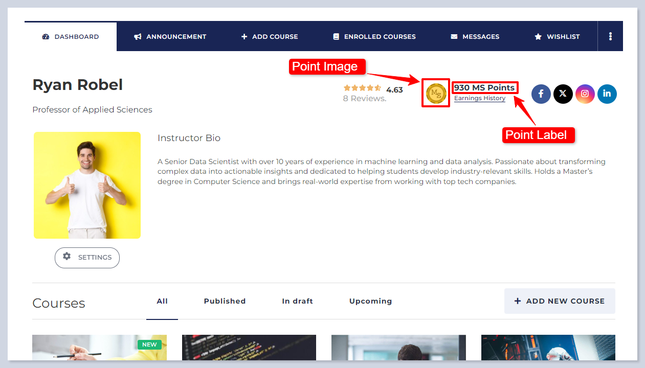 <figure><img src="https://691205473-files.gitbook.io/~/files/v0/b/gitbook-x-prod.appspot.com/o/spaces%2F-MDTL6WUldKvxQaP8jzz%2Fuploads%2Fh8V1yD3PnMqoVRgZo6nC%2Fimage.png?alt=media&#x26;token=151f7d86-5fd1-41c2-a345-06bd174dd994" alt=""><figcaption><p>Points in the Instructors Dashboard</p></figcaption></figure>