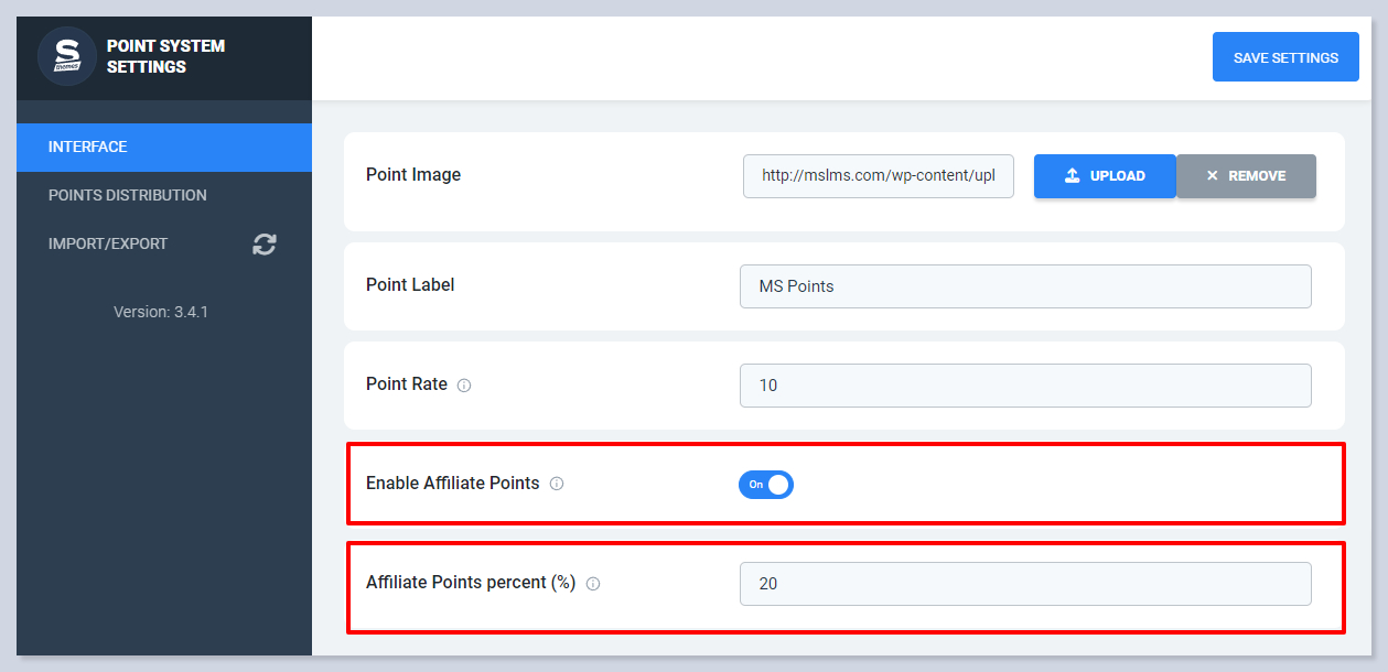 1. First of all, you need to activate the **Affiliate Points**. Go to the [**Interface tab**](#interface-tab) of the Point System Settings and **Enable Affiliate Points**. Then, set the amount of percent students will receive from the affiliate.