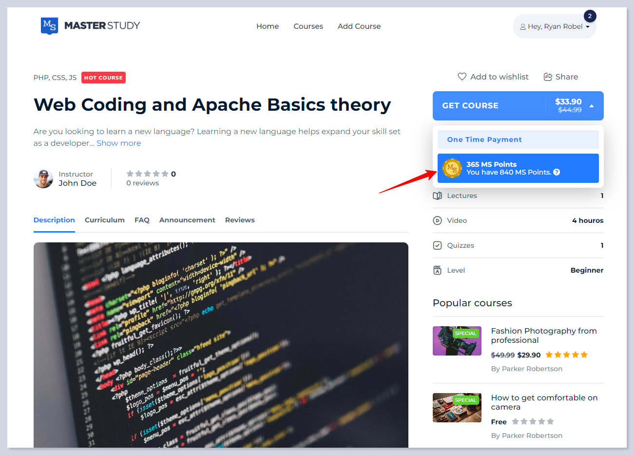 When a student wants to buy a new course there will be an additional option of buying it for points. Also, learners will be shown the exact amount they lack to purchase.