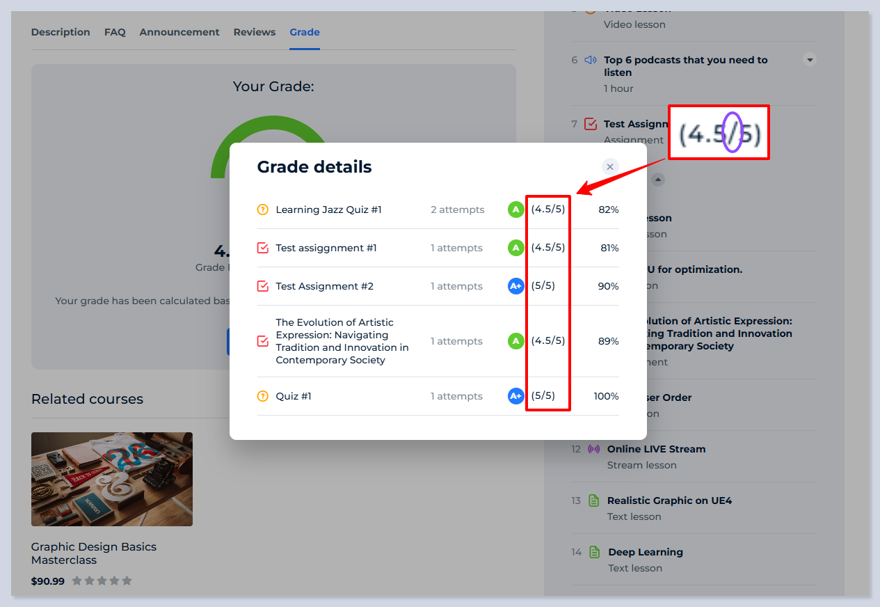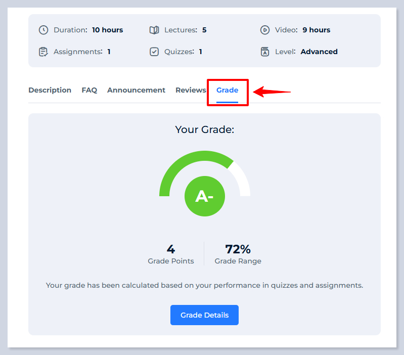 This setting enables you to control the display of the **Course Grade** in the[ **Single Course Page**](https://docs.stylemixthemes.com/masterstudy-lms/lms-settings/course). Choose one of the available ways you want to display the grade: