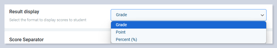 **Result Display** setting enables to display of the grade scores of the student in one of the three available formats: