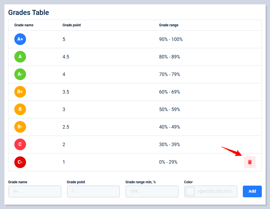 You can add new grades at the bottom of the [**Grades Table:**](#grades-table)