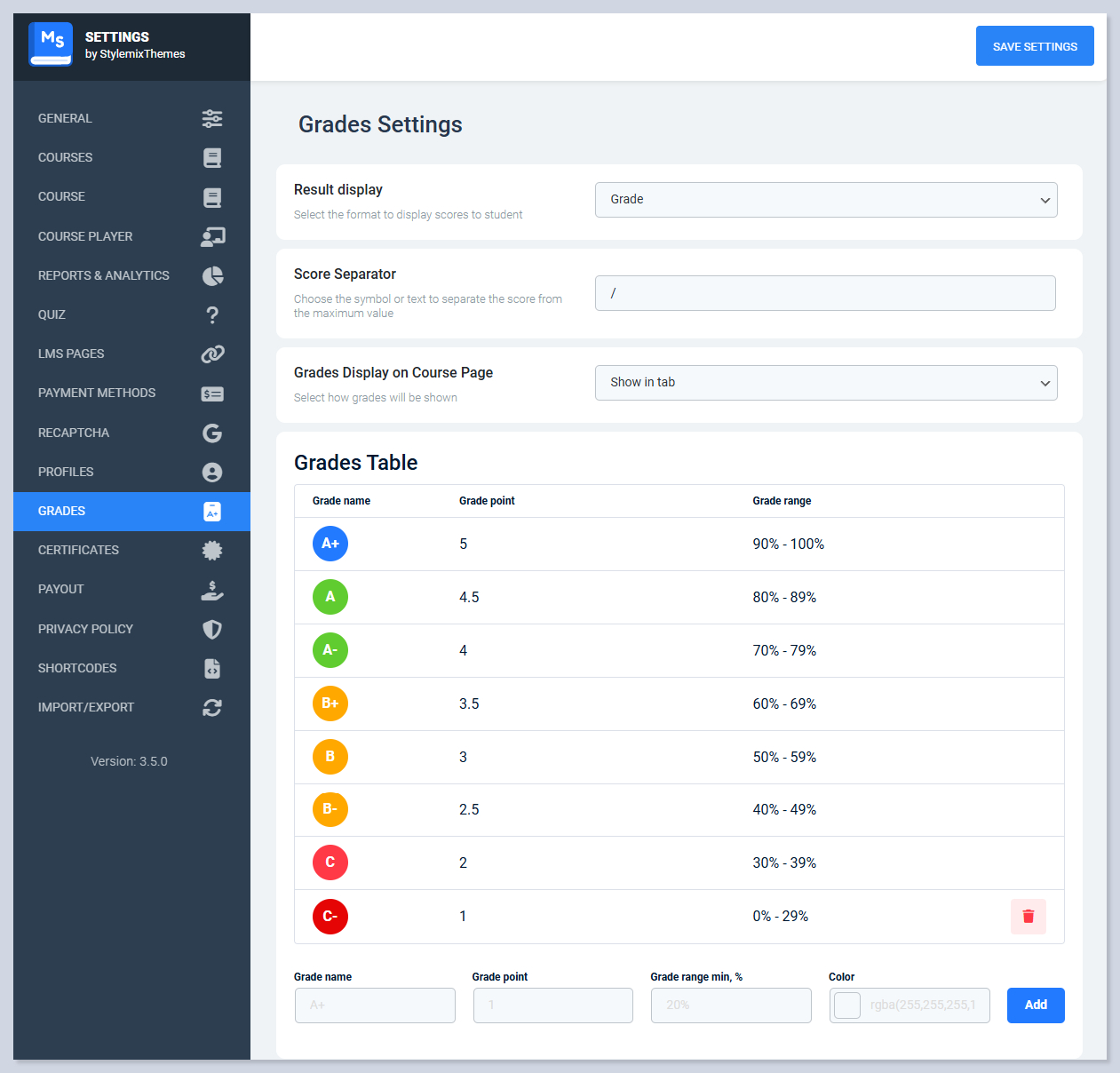 The grades tab of the plugin settings contains several parameters to manage the [Grades Feature](https://docs.stylemixthemes.com/masterstudy-lms/lms-pro-addons/grades) of the MasterStudy LMS. Here is the overview of the tab: