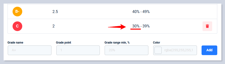 As you see from the picture, **30%** is the minimum range value for the grade C. So the minimum range of our new grade should be less than 30.  After filling required fields, click on the <mark style="color:purple;">**Add**</mark> button to add the grade.